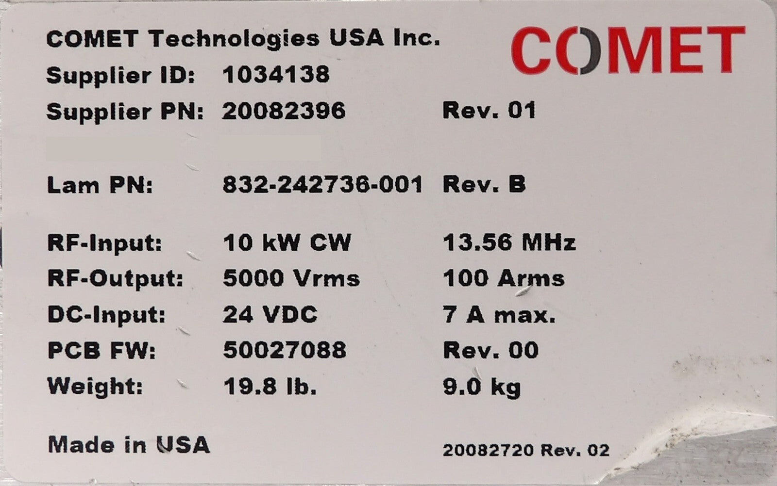 Comet Technologies 20082396 RF Match Lam Research 832-242736-001 Working Surplus