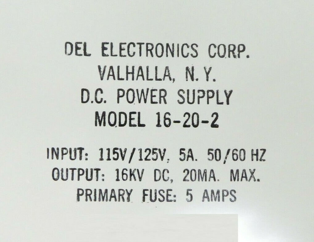This Del Electronics 16-20-2 High Voltage Power Supply is new surplus. The physical condition is great.