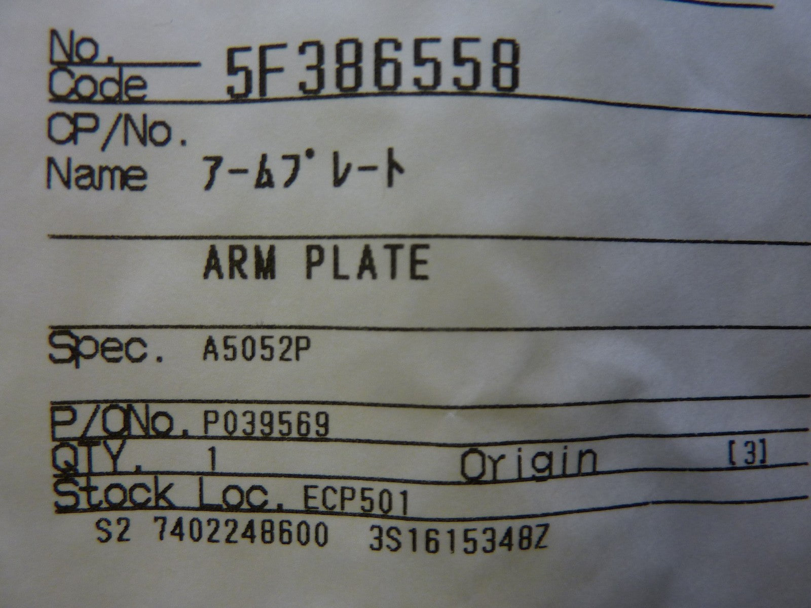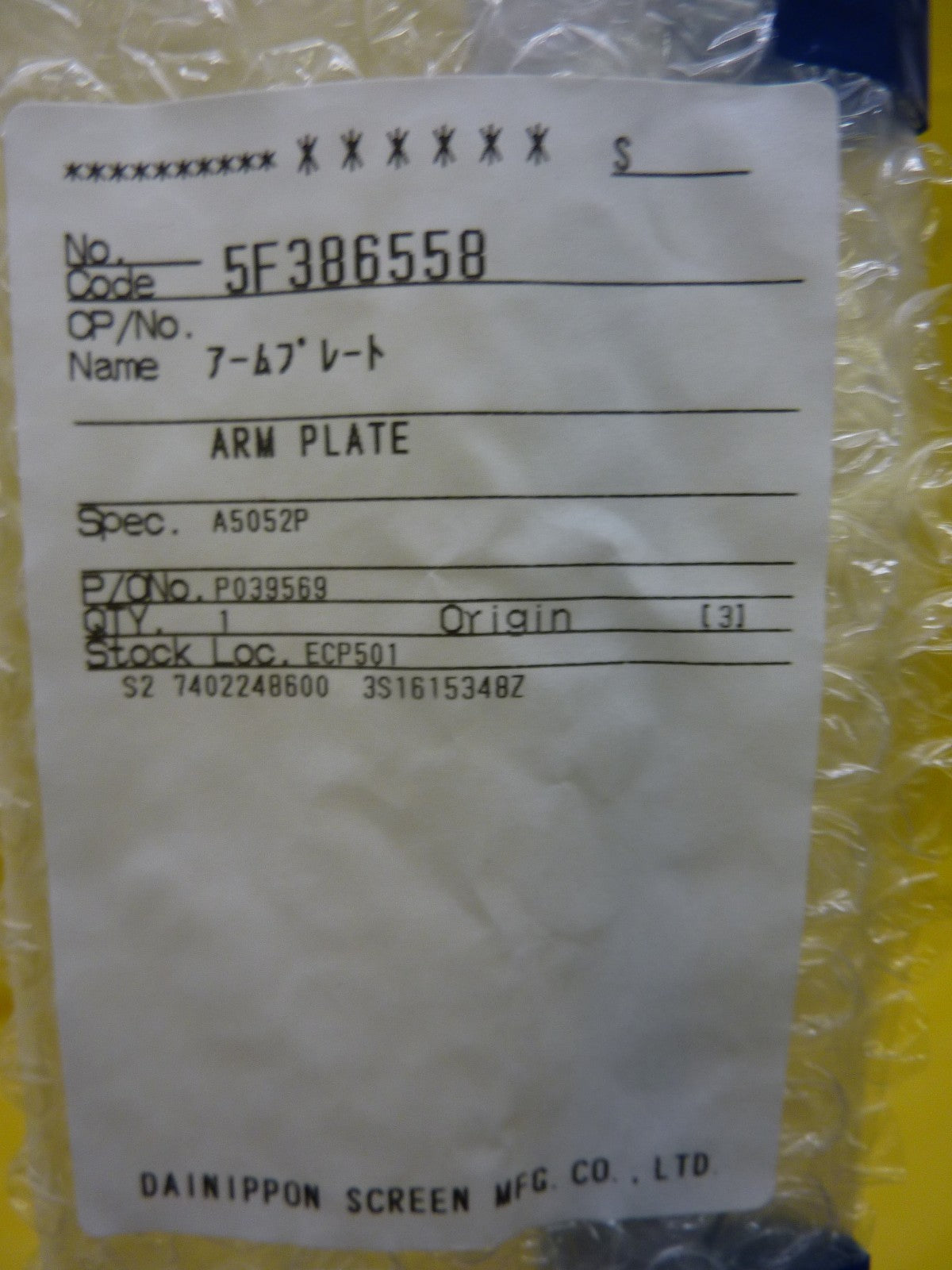 DNS Dainippon Screen 5F386558 Arm Plate A5052P New Surplus