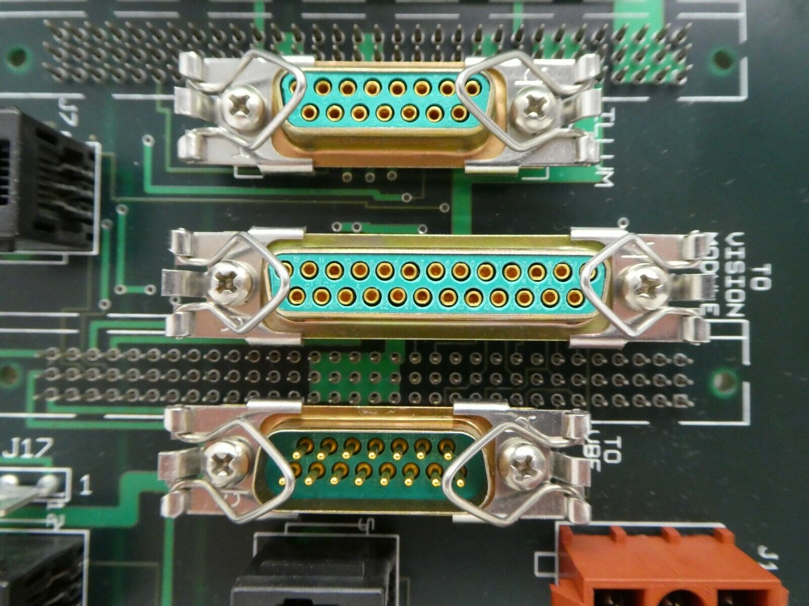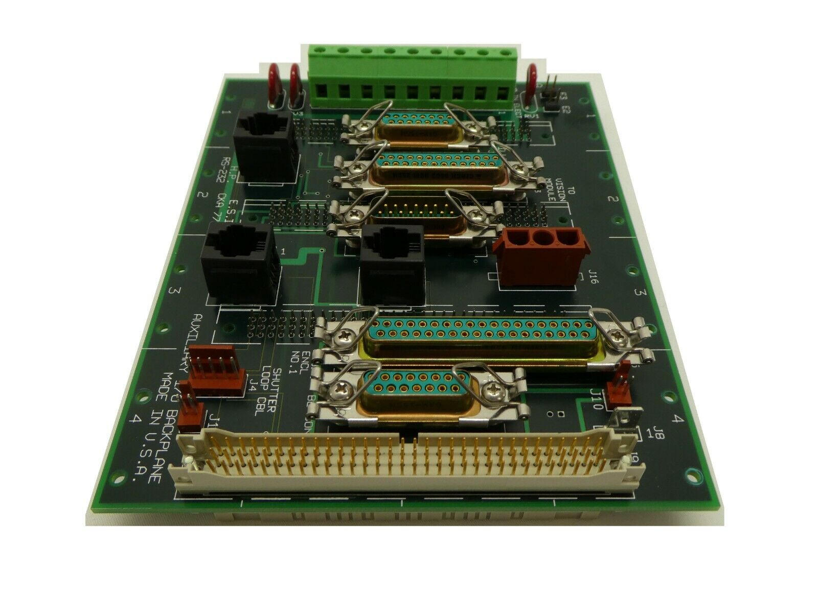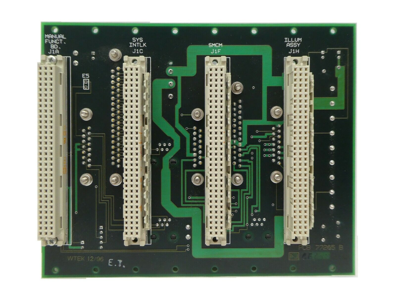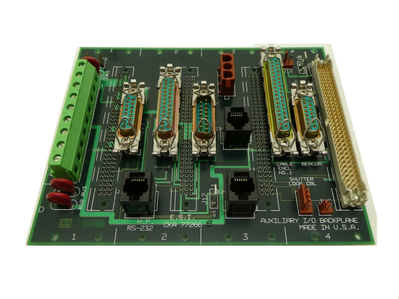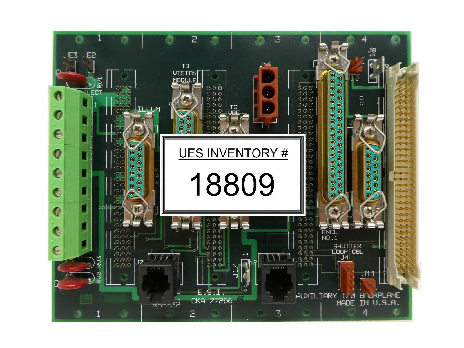 This ESI Electro Scientific Industries CKA 77266 Auxiliary I/O Backplane PCB is used working surplus. The physical condition is good, but there are signs of previous use and handling.