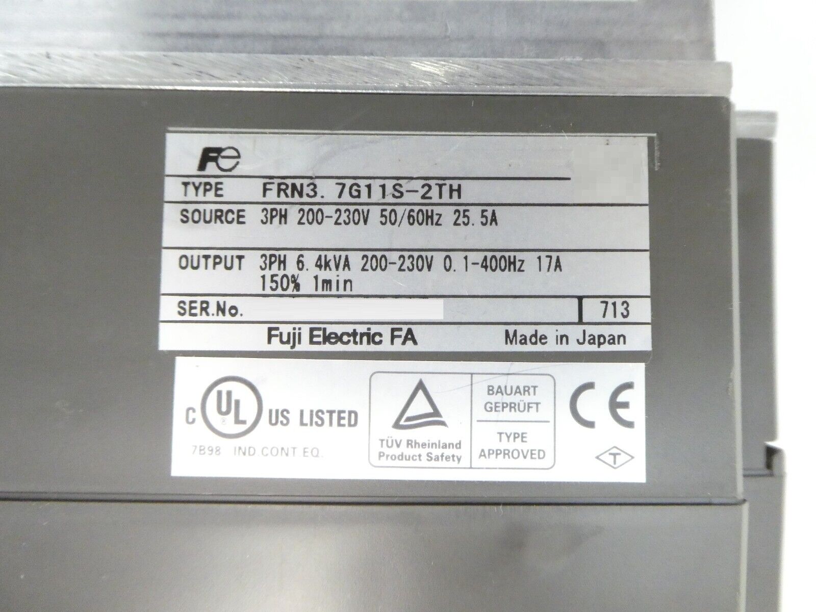 This Fuji Electric FRN3.7G11S-2TH is working surplus. The physical condition is good, but there are signs of previous use and handling.