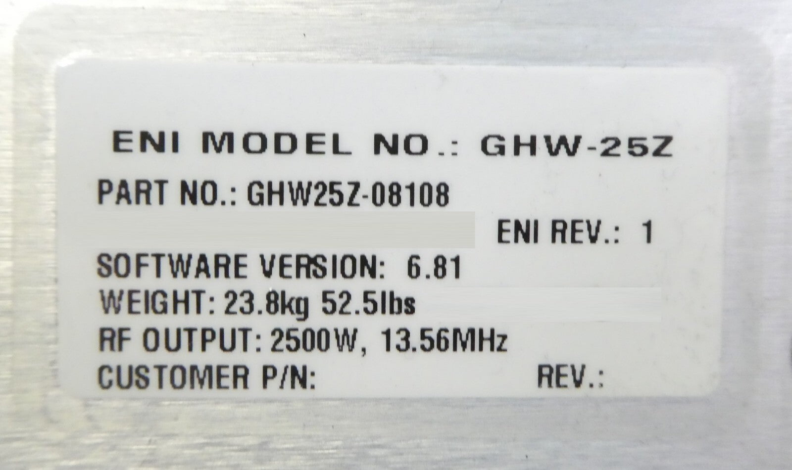 This GMW-25Z Genesis ENI Power Systems GHW25Z-08108 13.56MHz RF Generator is used working surplus. The physical condition is good, but there are signs of previous use and handling.
