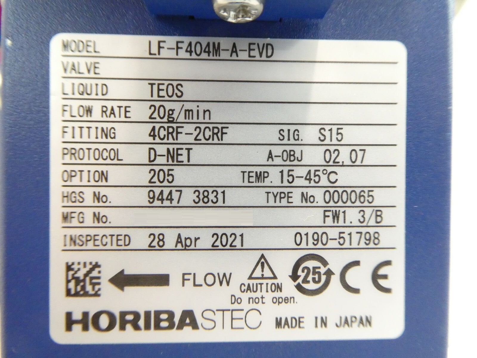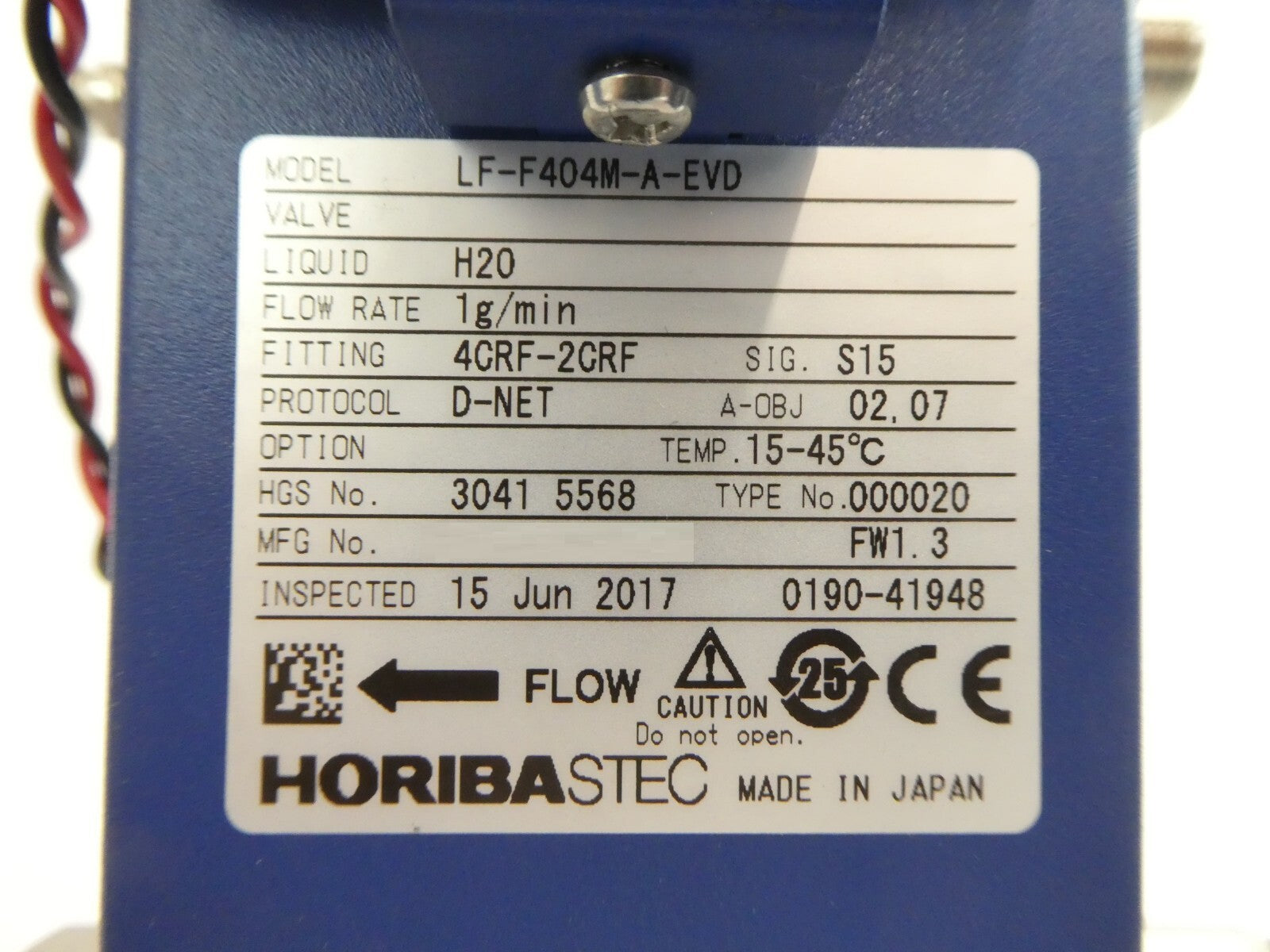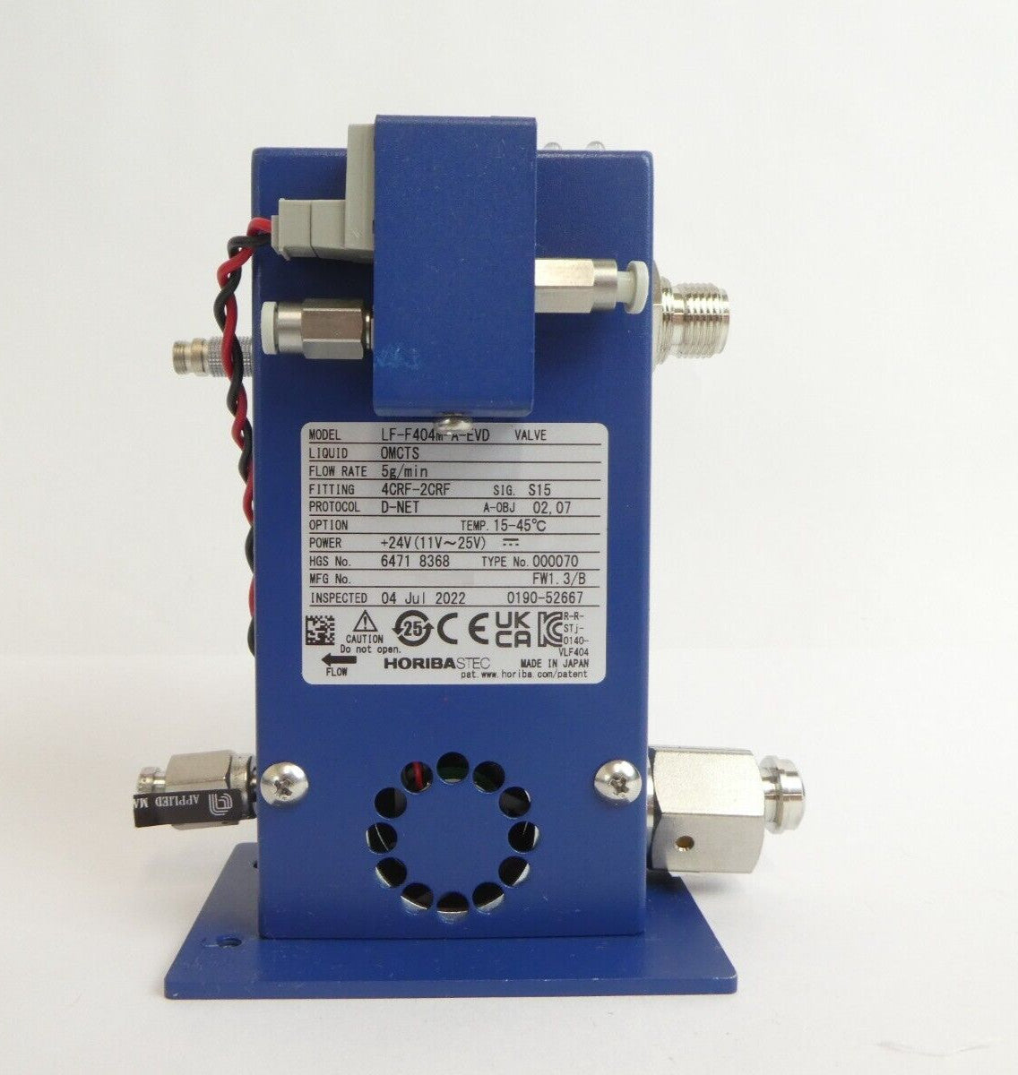 This Horiba STEC LF-F404M-A-EVD is working surplus. The physical condition is good, but there are signs of previous use and handling.