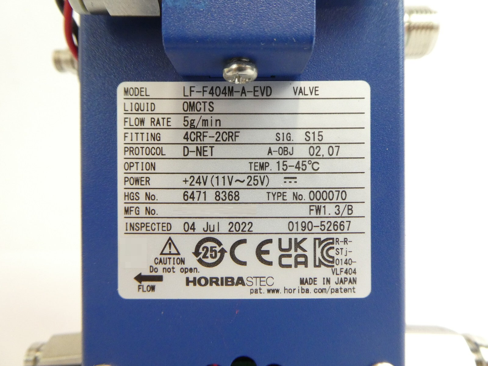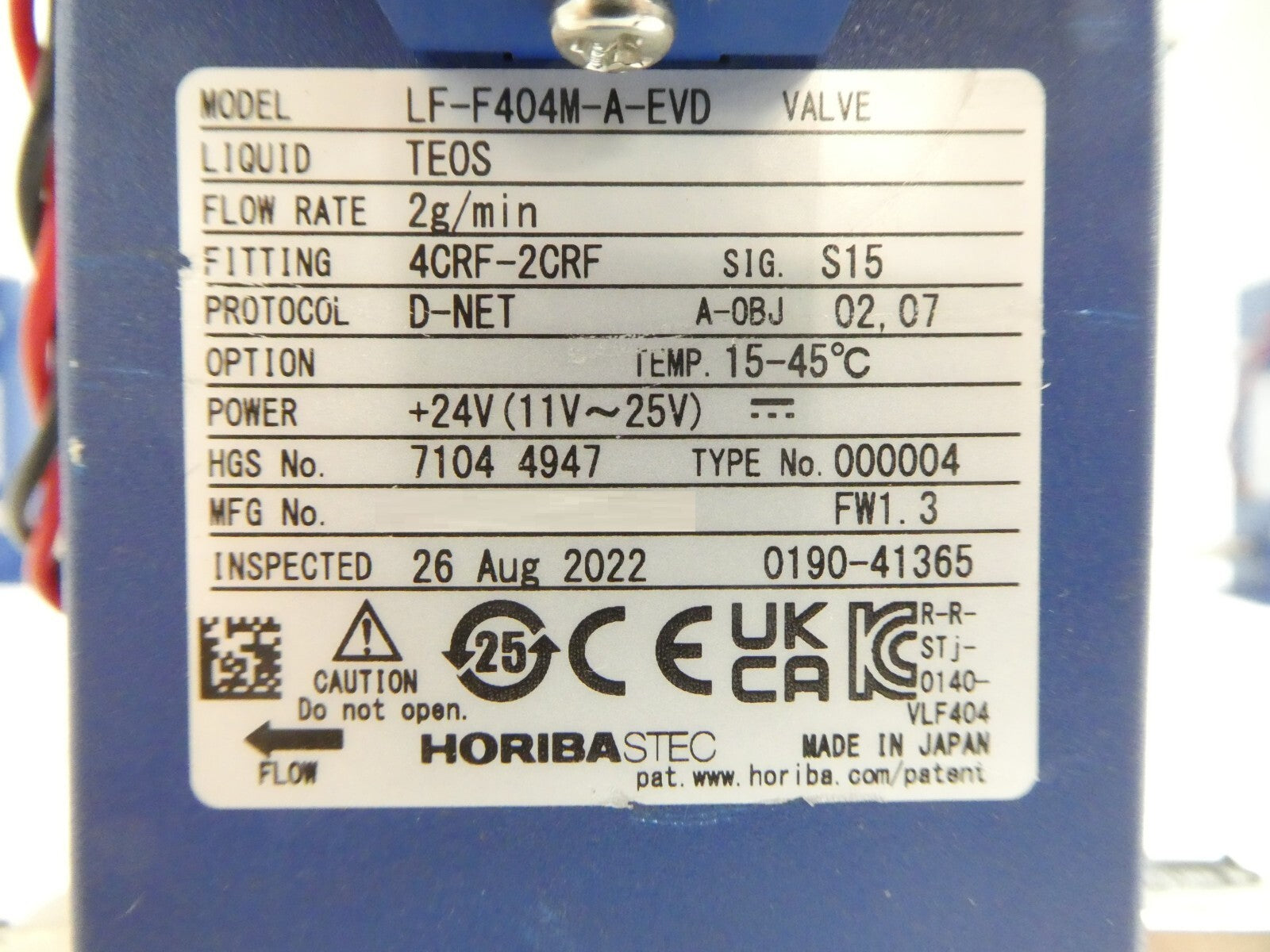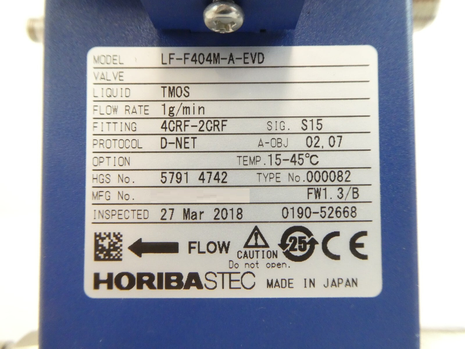 This Horiba STEC LF-F404M-A-EVD is working surplus. The physical condition is good, but there are signs of previous use and handling.