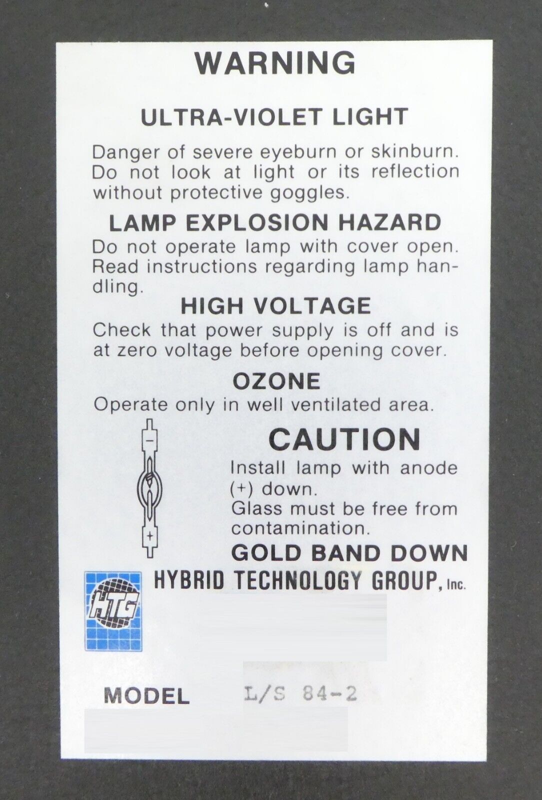 HTG Hybrid Technology Group L/S 84-2 Ultra-Violet Light Head Assembly Surplus