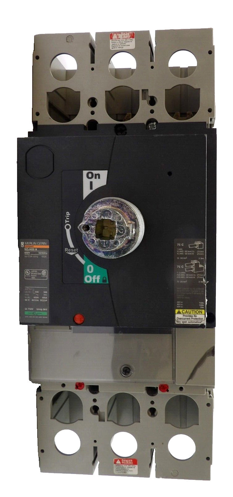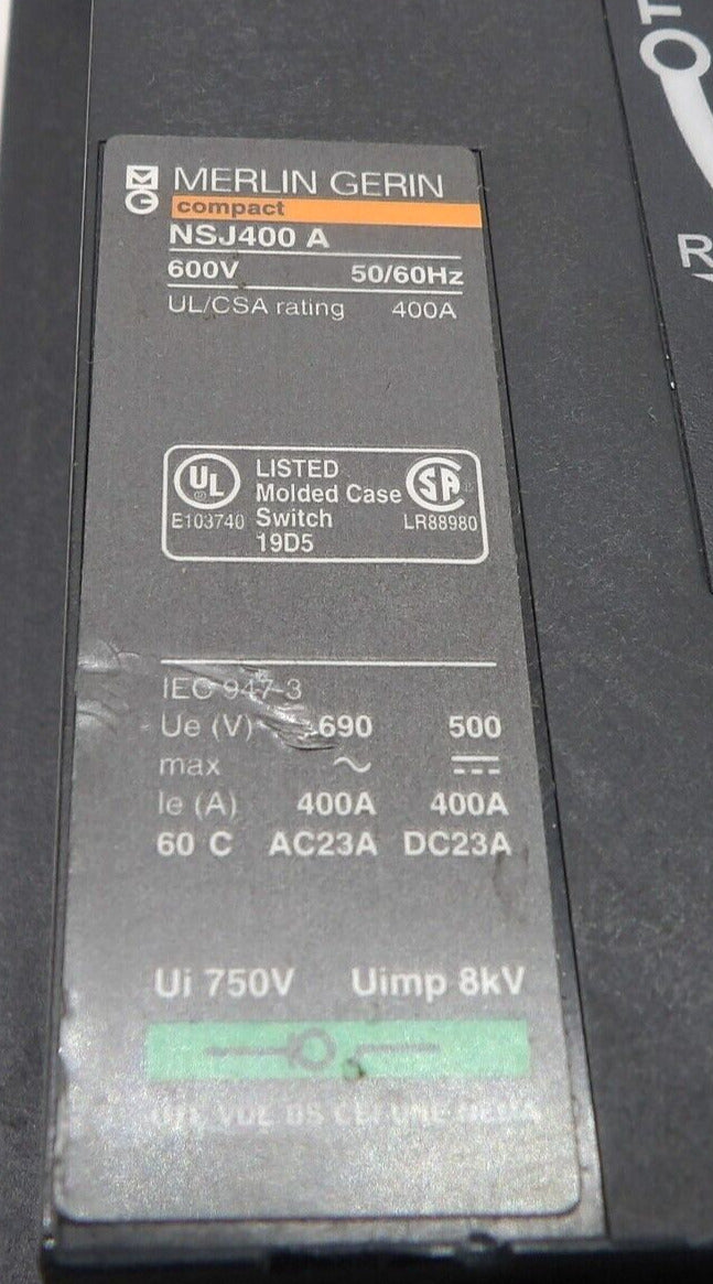 This Merlin Gerin NSJ400 A is working surplus. The physical condition is good, but there are signs of previous use and handling.