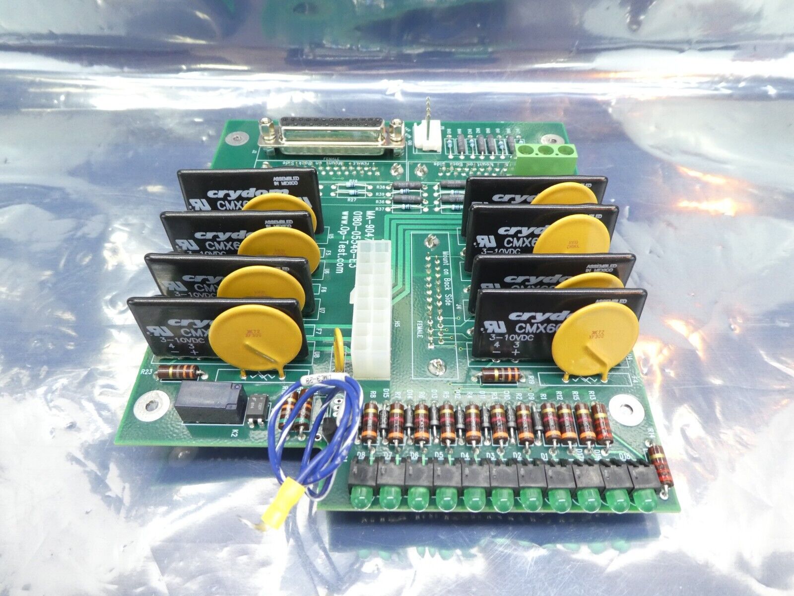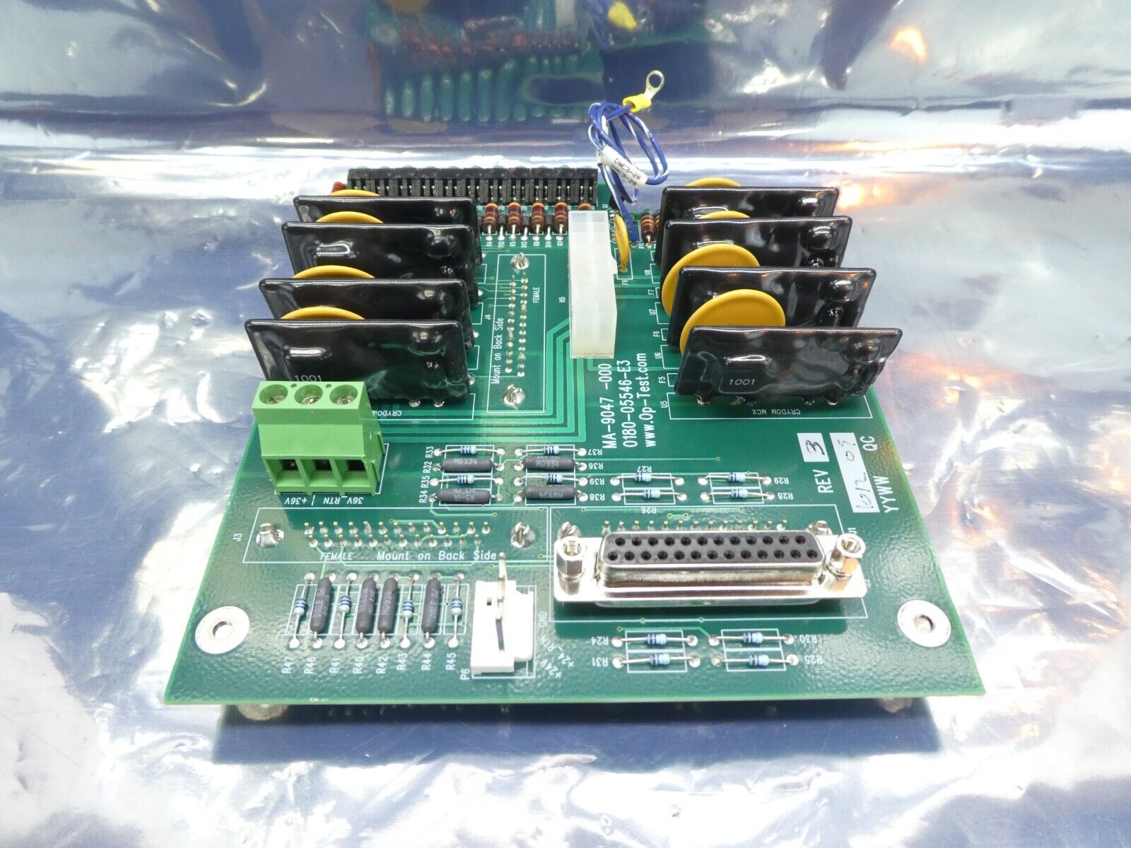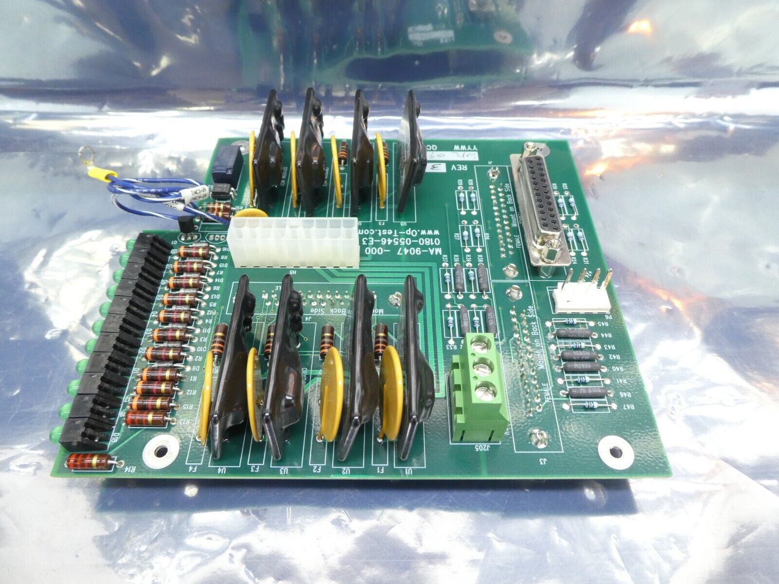 This Op-Test 0180-05546-E3 Interface PCB is used working surplus. The physical condition is good, but there are signs of previous use and handling.