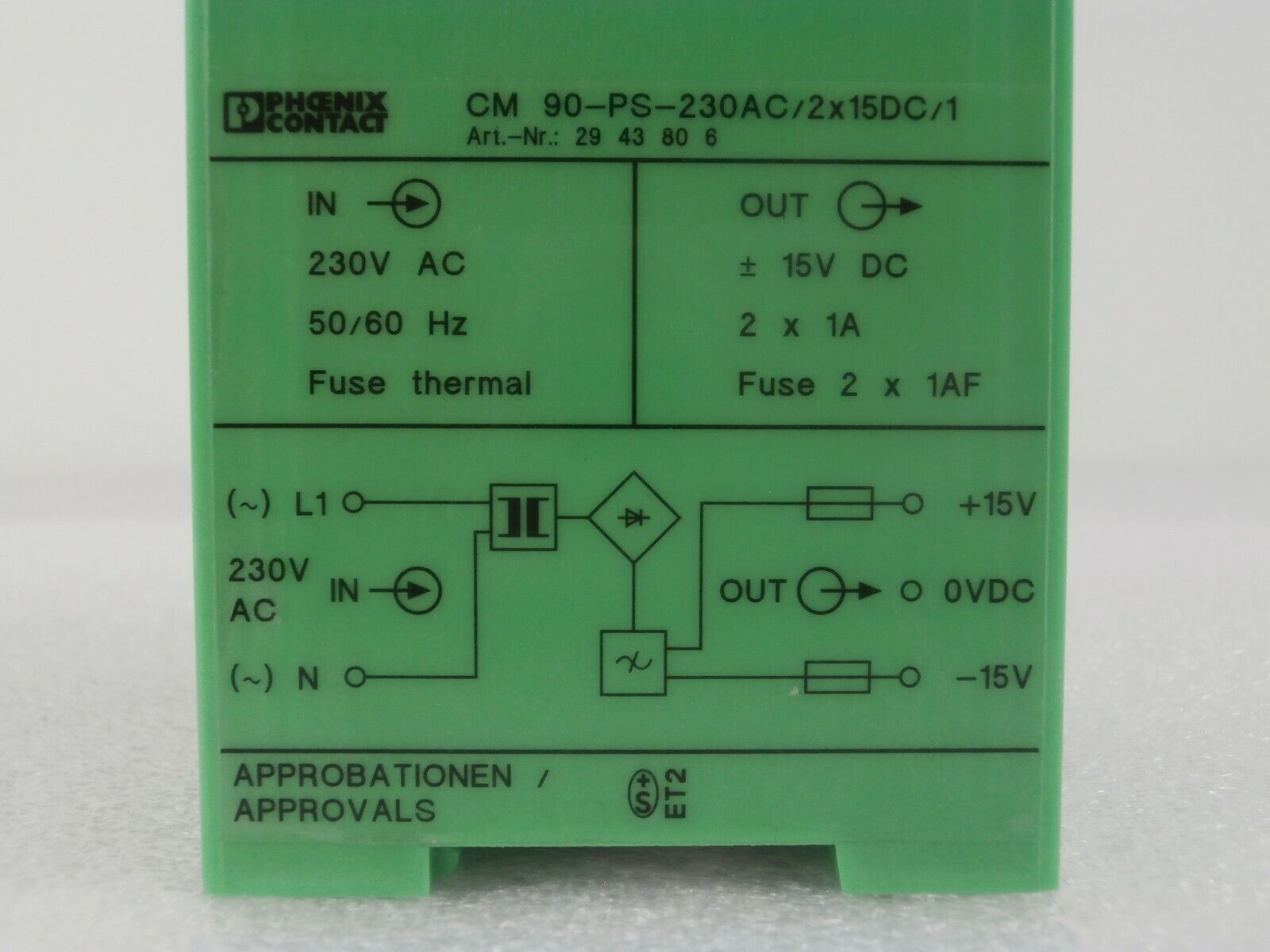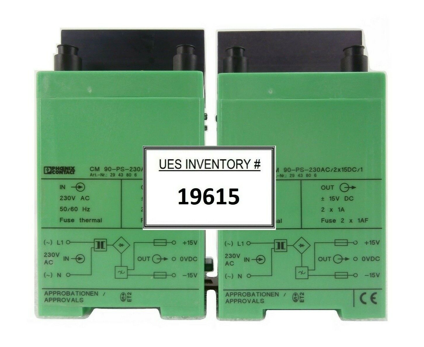 This Phoenix Contact 29 43 80 6 Power Supply CM 90-PS-230AC/2x15DC/1 Lot of 2 is used working surplus. The physical condition is good, but there are signs of previous use and handling.