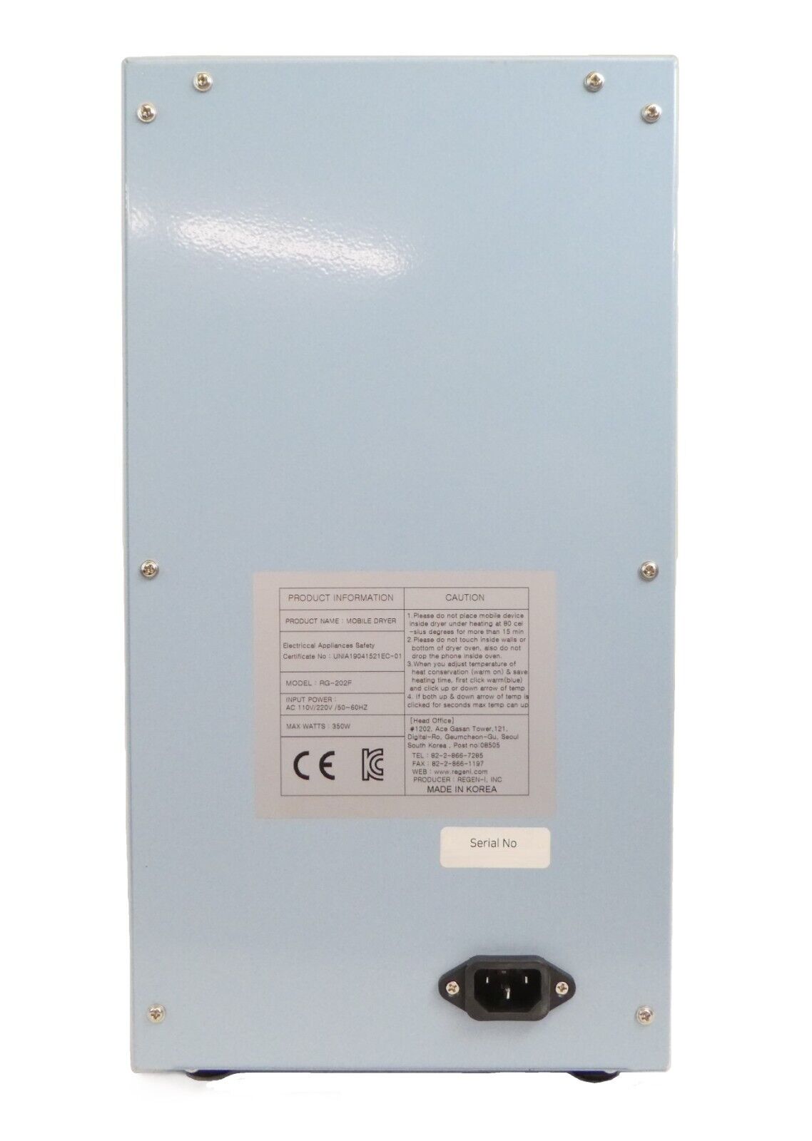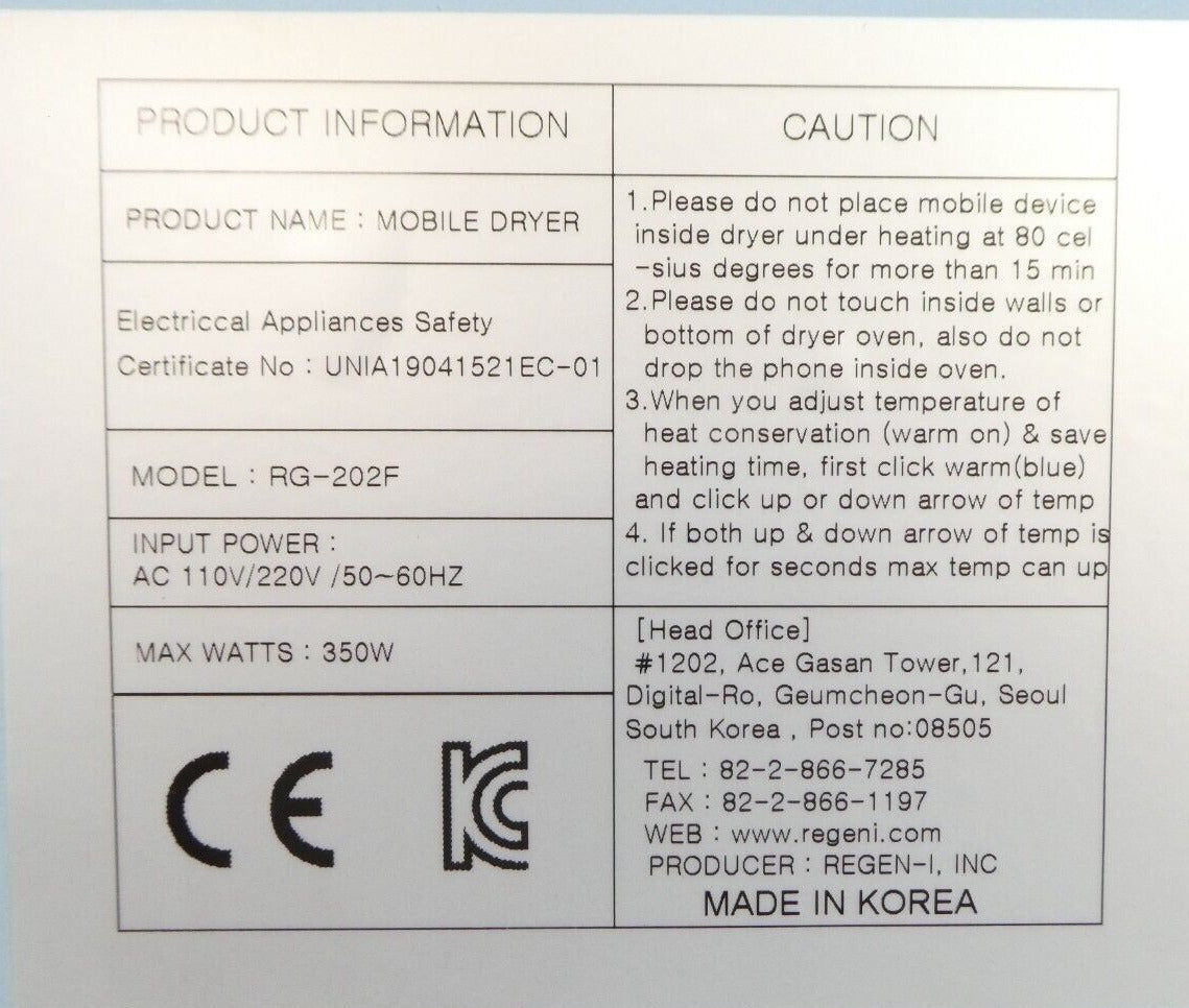 Regen-i RG-202F Mobile Dryer Electronics Heating Chamber Samsung GH81-11901B SVC JIG New