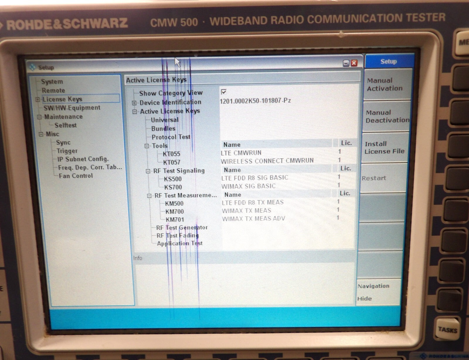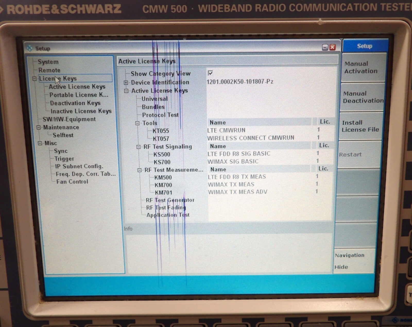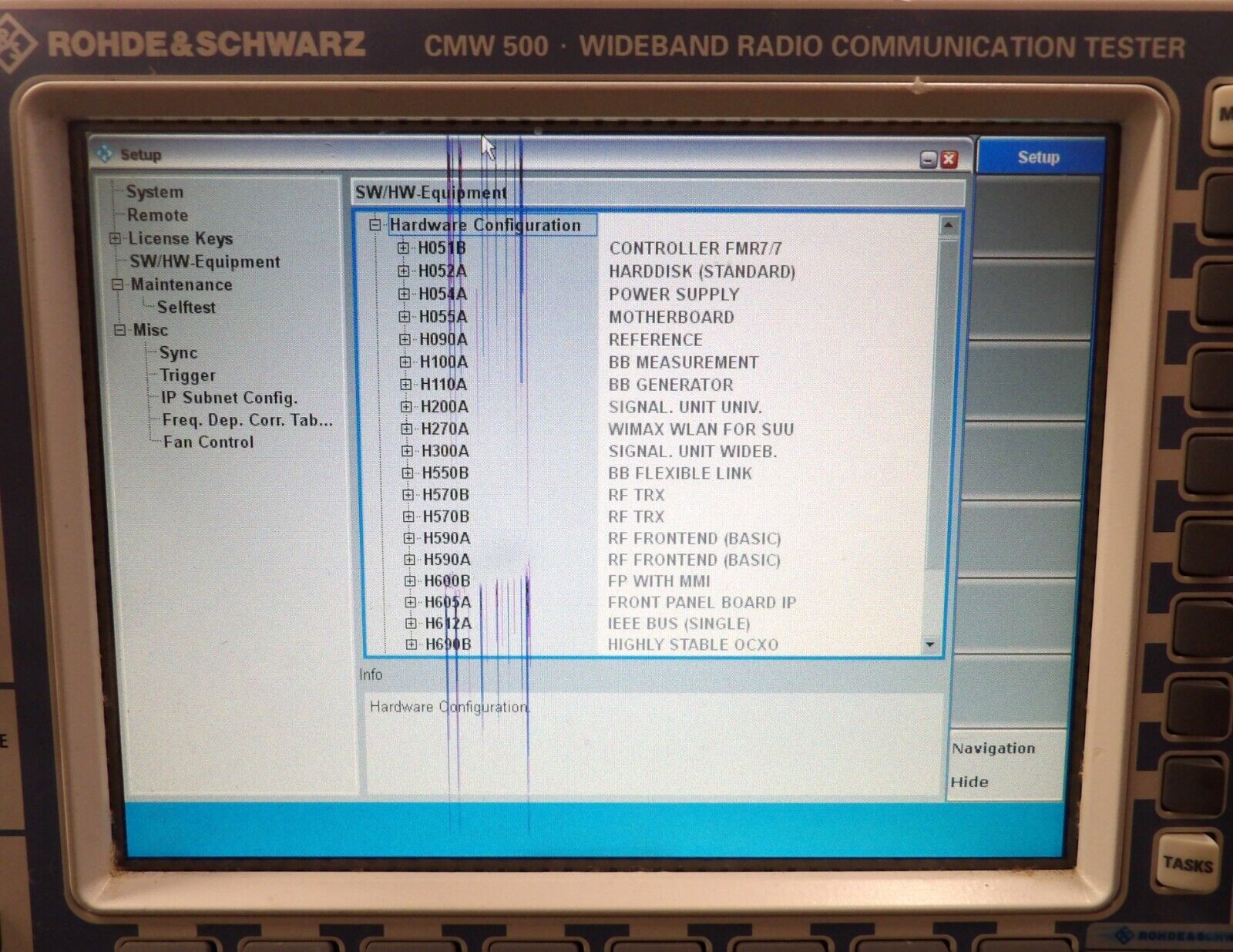 This Rohde & Schwarz 1201.0002K50 is untested surplus and is being sold as-is. This unit has a damaged screen, the unit passed all of the onboard self-tests (see photos). The physical condition is fair, but there are signs of previous use and handling.