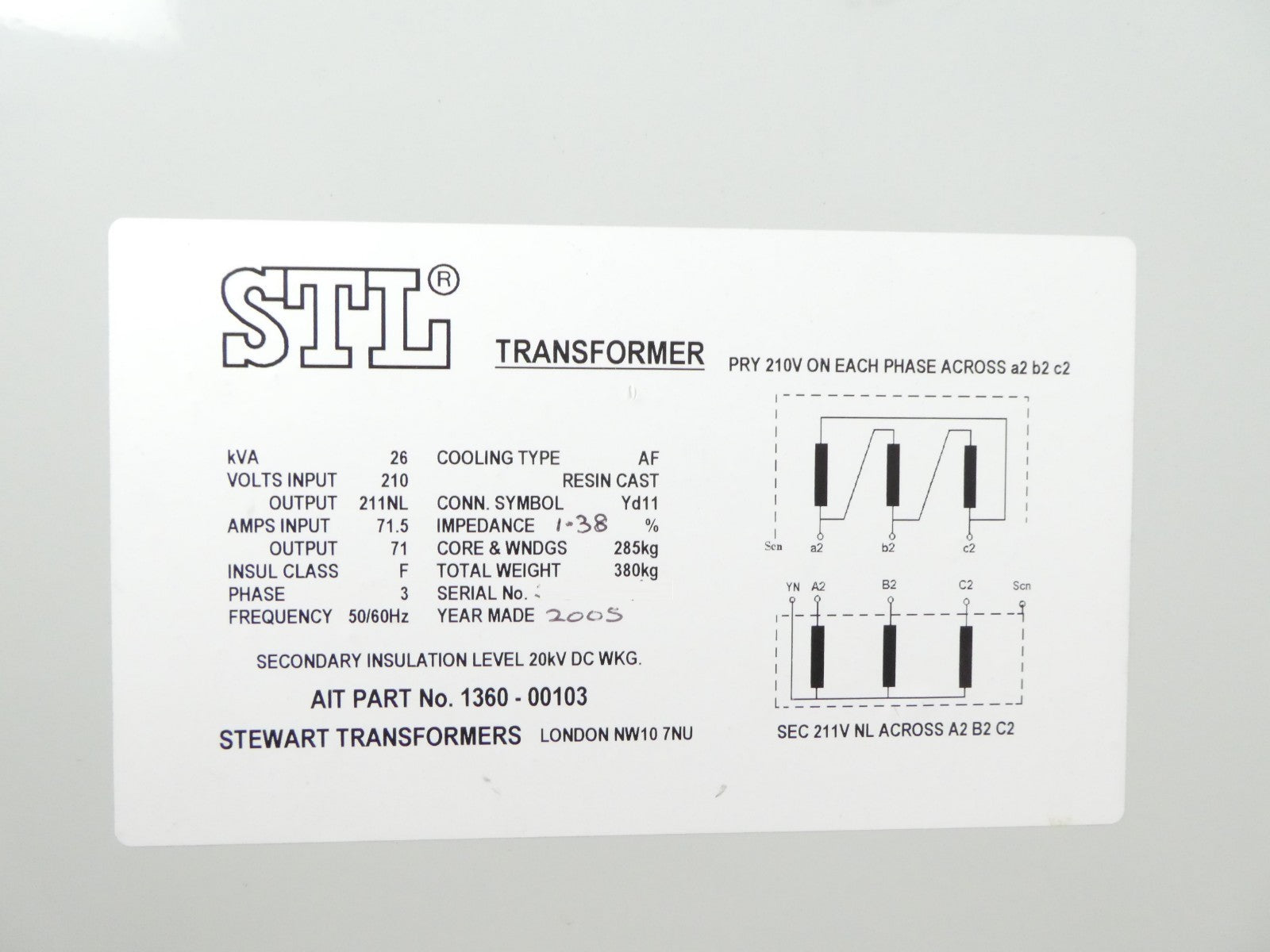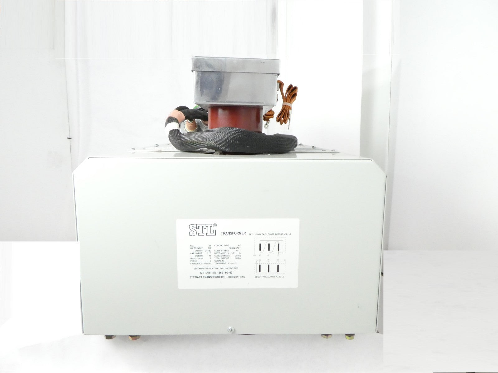 This STL Stewart Transformers 26kVA Transformer AIT 1360-00103 is used working surplus. The physical condition is good, but there are signs of previous use and handling.
