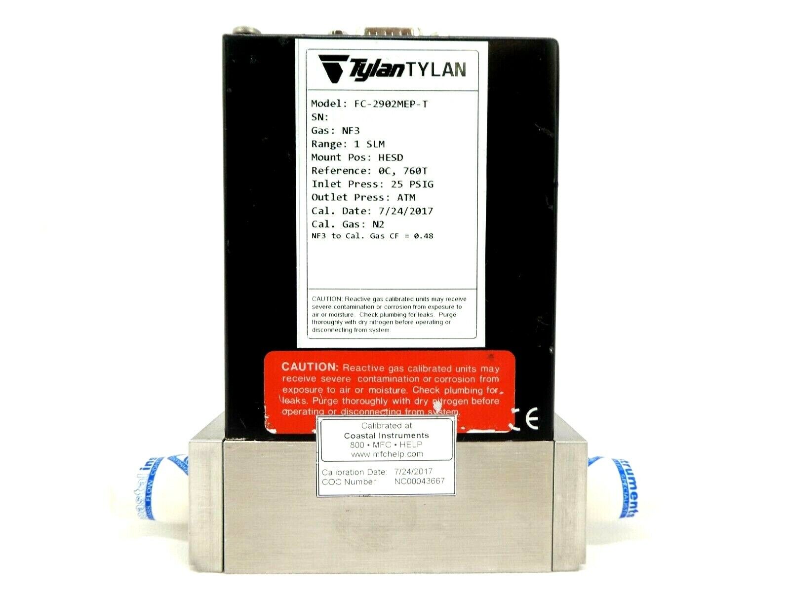 This Tylan FC-2902MEP-T Mass Flow Controller MFC is refurbished surplus. Includes Calibration Data Sheet. The physical condition is good, but there may be signs of previous use and handling.