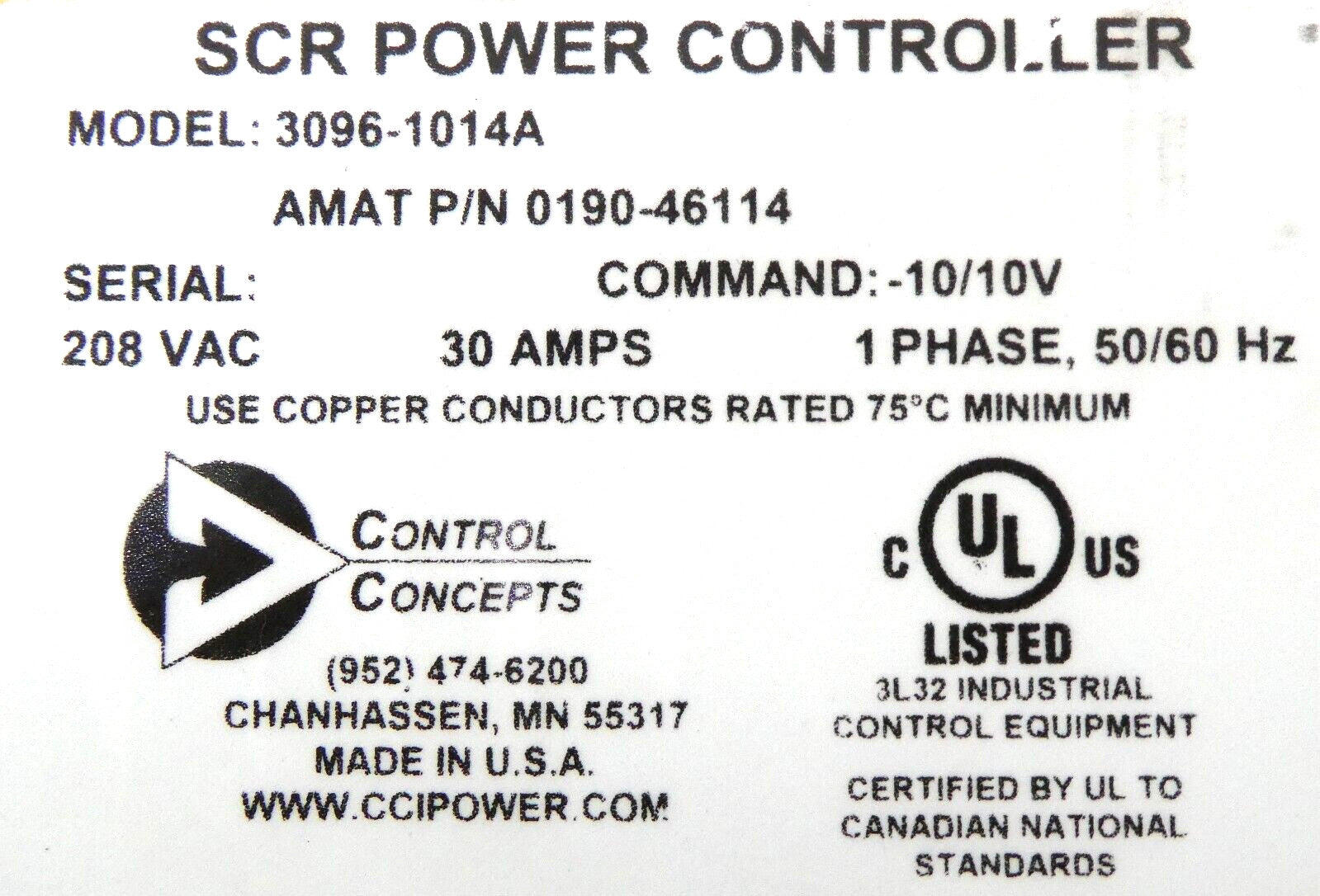 Control Concepts 3096-1014A SCR Power Controller AMAT 0190-46114 Working Surplus