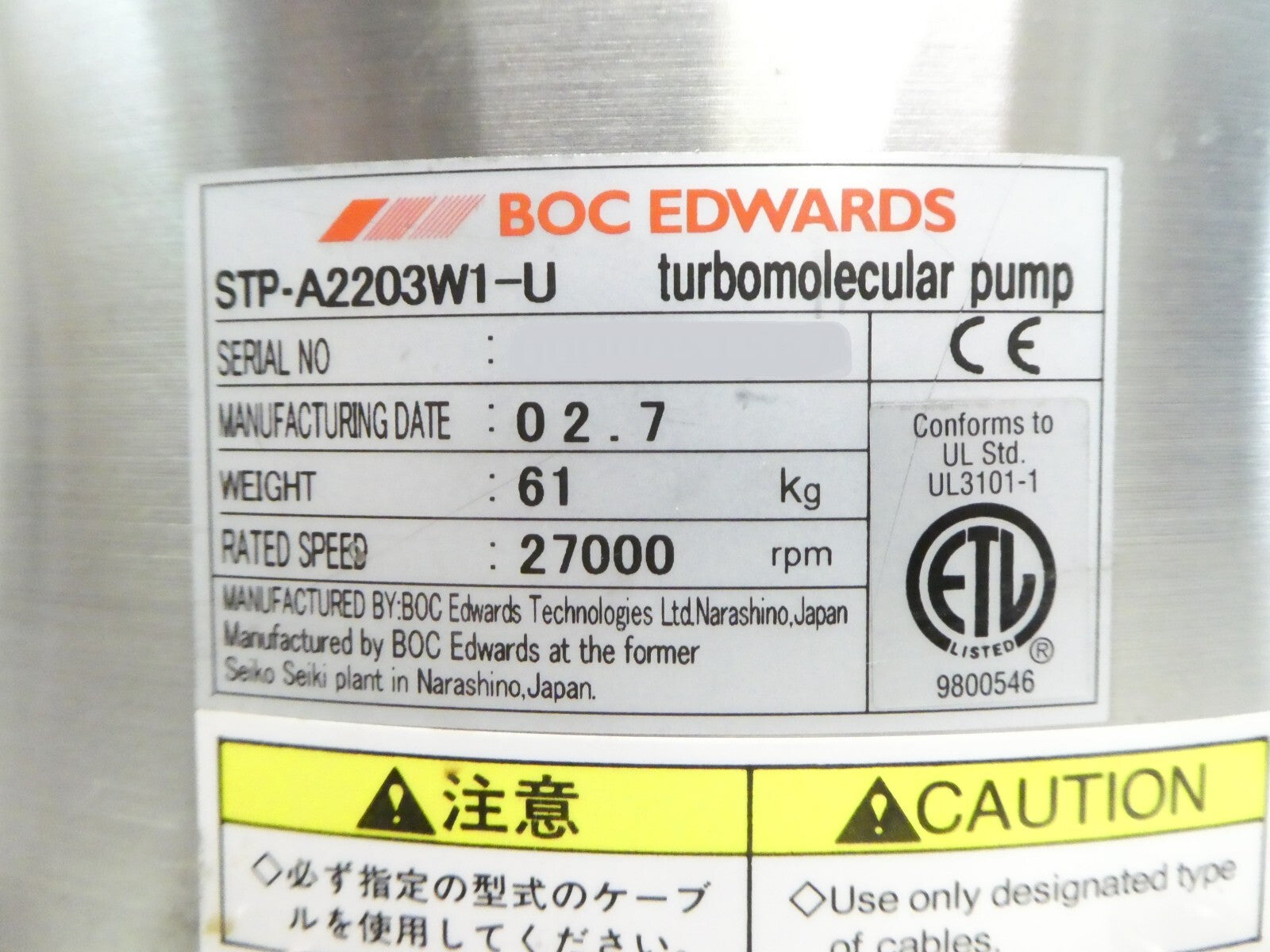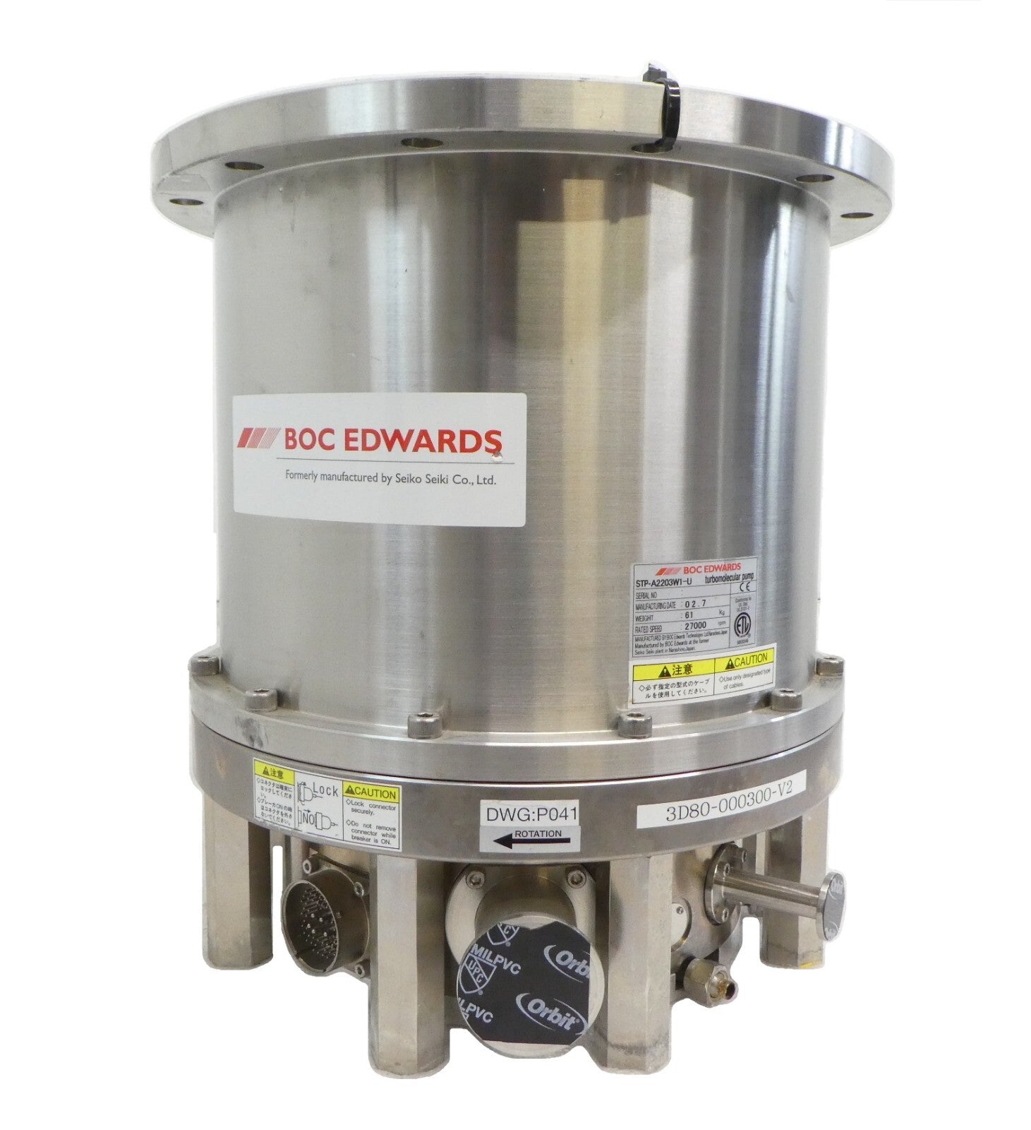 This STP Edwards STP-A2203W1-U Turbomolecular Pump is used working surplus. It was tested in our facility and is fully functional. The unit ramped up to full speed and pumped down to 3 mTorr with 4118 hours of run time. The physical condition is good, but there are signs of previous use and handling.