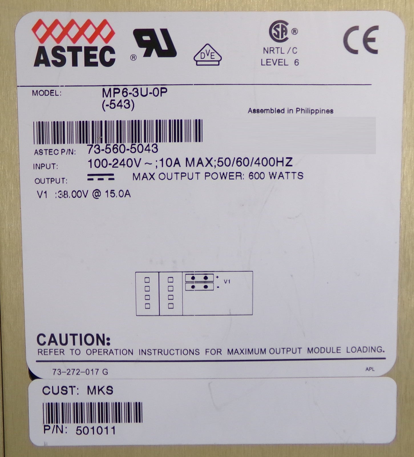Astec 73-560-5043 MVP Power Supply MP6-3U-0P(-543) MKS 501011 Working Surplus
