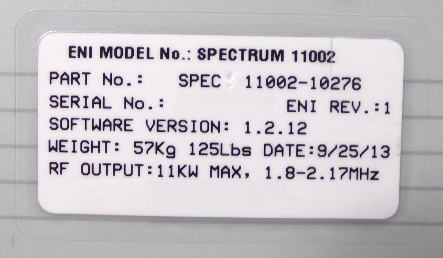 {"id":8590461599897,"title":"Spectrum MKS ENI Power Systems 11002-00 RF Generator 11kW @ 1.8-2.17MHz Dented","handle":"spectrum-mks-eni-power-systems-11002-00-rf-generator-11kw-1-8-2-17mhz-dented","description":"\u003cfont rwr=\"1\" size=\"4\" style=\"font-family:Arial\"\u003e\u003cstyle\u003eimg{max-width:100%}\u003c\/style\u003e\n\u003cmeta name=\"viewport\" content=\"width=device-width, initial-scale=1.0\"\u003e\n\u003clink rel=\"stylesheet\" type=\"text\/css\" href=\"https:\/\/dl.dropbox.com\/s\/wyx2vvvlzpn3dlq\/ebaystyle.css\"\u003e\n\u003ctable id=\"bodyUES\"\u003e\n\u003ctbody\u003e\n\u003ctr\u003e\n\u003ctd\u003e\n\u003cdiv id=\"content\"\u003e\n\u003cdiv id=\"colTwo\"\u003e\n\u003cdiv class=\"bg2\"\u003e\n\u003c!-- item title --\u003e\n\n\n\n\n\n\n\n\u003ch1\u003eSpectrum MKS ENI Power Systems 11002-00 RF Generator 11kW @ 1.8-2.17MHz Dented\u003c\/h1\u003e\n\n\n\n\n\n\n\n\n\u003cp\u003e\u003c!-- item description --\u003e\n\u003c\/p\u003e\n\u003cdiv class=\"description\"\u003e\n\n\n\n\n\u003cli\u003ePart No: SPECTRUM 11002-00\n\u003c\/li\u003e\n\u003cli\u003eModel No: SPECTRUM\n\u003c\/li\u003e\n\u003cli\u003eInput: 3ɸ, 200-208VAC\n\u003c\/li\u003e\n\u003cli\u003eOutput: 11000W @ 1.8-2.17MHz\n\u003c\/li\u003e\n\u003cli\u003eCE Marked\n\n\n\n\n\u003cp\u003e\n\nThis item is working surplus. The units rear panel and interlock cover are dented from removal or transport (see photos). The physical condition is good, but there are signs of previous use and handling.\n\n\n\n\n\n\n\n\u003c\/p\u003e\n\u003c\/li\u003e\n\u003c\/div\u003e\n\u003cp\u003e\u003c\/p\u003e\n\u003ch3\u003eSale Details\u003c\/h3\u003e\n\u003cp\u003e\n\u003c\/p\u003e\n\u003cdiv class=\"sales\"\u003e\n\u003c!-- item condition \u0026 dimensions --\u003e\n\u003cul\u003e\n\u003cli\u003e\n\u003cb\u003eItem Condition:\u003c\/b\u003e Working, 90 Day Warranty\n\n\n\u003c\/li\u003e\n\u003cli\u003e\n\u003cb\u003eEstimated Packed Shipping Dimensions:\u003c\/b\u003e L x W x H = 36\"x24\"x20\" @ 250 lbs.; Requires Freight Shipping\n\n\n\u003c\/li\u003e\n\u003cli\u003e\n\u003cfont color=\"#ff0010\"\u003e\u003cb\u003eShipping Terms:\u003c\/b\u003e\u003c\/font\u003e All Domestic and International shipping quotes and\/or fees are subject to change due to packaging requirements, custom packing, transport rate fluctuations, and supply chain demands. We will contact you regarding any shipments that require or incur additional after purchase packing fees or rate changes.\n\u003c\/li\u003e\n\u003cli\u003e\n\u003cb\u003eOnly items pictured are included:\u003c\/b\u003e If a part is not pictured, or mentioned above, then it is not included in the sale. Pictured test equipment is not included or available for sale.\n\u003c\/li\u003e\n\u003cli\u003e\n\u003cb\u003eFor items with multiple quantities:\u003c\/b\u003e The pictured item is not necessarily the one that will be sent. Serial numbers or country of manufacture may vary.\n\u003c\/li\u003e\n\u003cli\u003eNew, Refurbished, and Working items are sold with a \u003cfont color=\"#008000\"\u003e\u003cb\u003e90-Day Satisfaction Guarantee\u003c\/b\u003e\u003c\/font\u003e\n\u003cp\u003e\n\n\n\u003cstrong\u003eLister 31\u003c\/strong\u003e\n\n\n\n\n\u003c\/p\u003e\n\u003c\/li\u003e\n\u003c\/ul\u003e\n\u003c\/div\u003e\n\u003c\/div\u003e\n\u003c\/div\u003e\n\u003c\/div\u003e\n\u003c\/td\u003e\n\u003c\/tr\u003e\n\u003ctr\u003e\n\u003ctd align=\"left\"\u003e\u003c\/td\u003e\n\u003c\/tr\u003e\n\u003c\/tbody\u003e\n\u003c\/table\u003e\n\u003cdiv\u003e\u003c\/div\u003e\n\u003cdiv\u003e\u003c\/div\u003e\n\u003cdiv\u003e\u003c\/div\u003e\n\u003cdiv\u003e\u003c\/div\u003e\n\u003cdiv\u003e\u003c\/div\u003e\n\u003cp\u003e\u003c\/p\u003e\u003c\/font\u003e \u003cbr\u003eListed with ExportYourStore.com","published_at":"2026-01-09T15:30:55-07:00","created_at":"2025-12-02T12:38:02-07:00","vendor":"ENI Power Systems","type":"Business \u0026 Industrial:Test, Measurement \u0026 Inspection:Signal Sources \u0026 Conditioning:Other Signal Sources \u0026 Conditioning","tags":[],"price":1365796,"price_min":1365796,"price_max":1365796,"available":true,"price_varies":false,"compare_at_price":2101225,"compare_at_price_min":2101225,"compare_at_price_max":2101225,"compare_at_price_varies":false,"variants":[{"id":45957874253977,"title":"Default Title","option1":"Default Title","option2":null,"option3":null,"sku":"CONL-12529","requires_shipping":true,"taxable":true,"featured_image":null,"available":true,"name":"Spectrum MKS ENI Power Systems 11002-00 RF Generator 11kW @ 1.8-2.17MHz Dented","public_title":null,"options":["Default Title"],"price":1365796,"weight":113398,"compare_at_price":2101225,"inventory_management":"shopify","barcode":null,"requires_selling_plan":false,"selling_plan_allocations":[]}],"images":["\/\/semiconductorspares.com\/cdn\/shop\/files\/57_90b39d43-ec2a-4832-8af9-a98a456d0d2a.jpg?v=1771957509","\/\/semiconductorspares.com\/cdn\/shop\/files\/57_fb29fec6-729b-4e03-9fe5-aea4d2b260a0.jpg?v=1771957509","\/\/semiconductorspares.com\/cdn\/shop\/files\/57_f710bb0b-7726-427d-bec8-a75c0ff9a003.jpg?v=1771957509","\/\/semiconductorspares.com\/cdn\/shop\/files\/57_415d483d-1b63-4625-aa6f-1bfbb32a0d37.jpg?v=1771957509","\/\/semiconductorspares.com\/cdn\/shop\/files\/57_3263d5b4-f32a-427e-8489-c14fc6018738.jpg?v=1771957509","\/\/semiconductorspares.com\/cdn\/shop\/files\/57_c9b5b8e3-4917-4392-8e2e-1c09b8be094a.jpg?v=1771957509","\/\/semiconductorspares.com\/cdn\/shop\/files\/57_9480baff-6178-41d5-9726-d279388b8c48.jpg?v=1771957509","\/\/semiconductorspares.com\/cdn\/shop\/files\/57_9e3ca525-c27d-4292-ad29-01fe557c770f.jpg?v=1771957509","\/\/semiconductorspares.com\/cdn\/shop\/files\/57_5f3c45b5-2798-4e25-a143-7cd9336799ef.jpg?v=1771957509","\/\/semiconductorspares.com\/cdn\/shop\/files\/57_9b1f1e5a-3632-4b1d-af7b-16f390db49e5.jpg?v=1771957509","\/\/semiconductorspares.com\/cdn\/shop\/files\/57_0054168e-1472-419c-8f74-d6b5c8ba8482.jpg?v=1771957509","\/\/semiconductorspares.com\/cdn\/shop\/files\/57_46c22b91-a359-41d6-ac39
