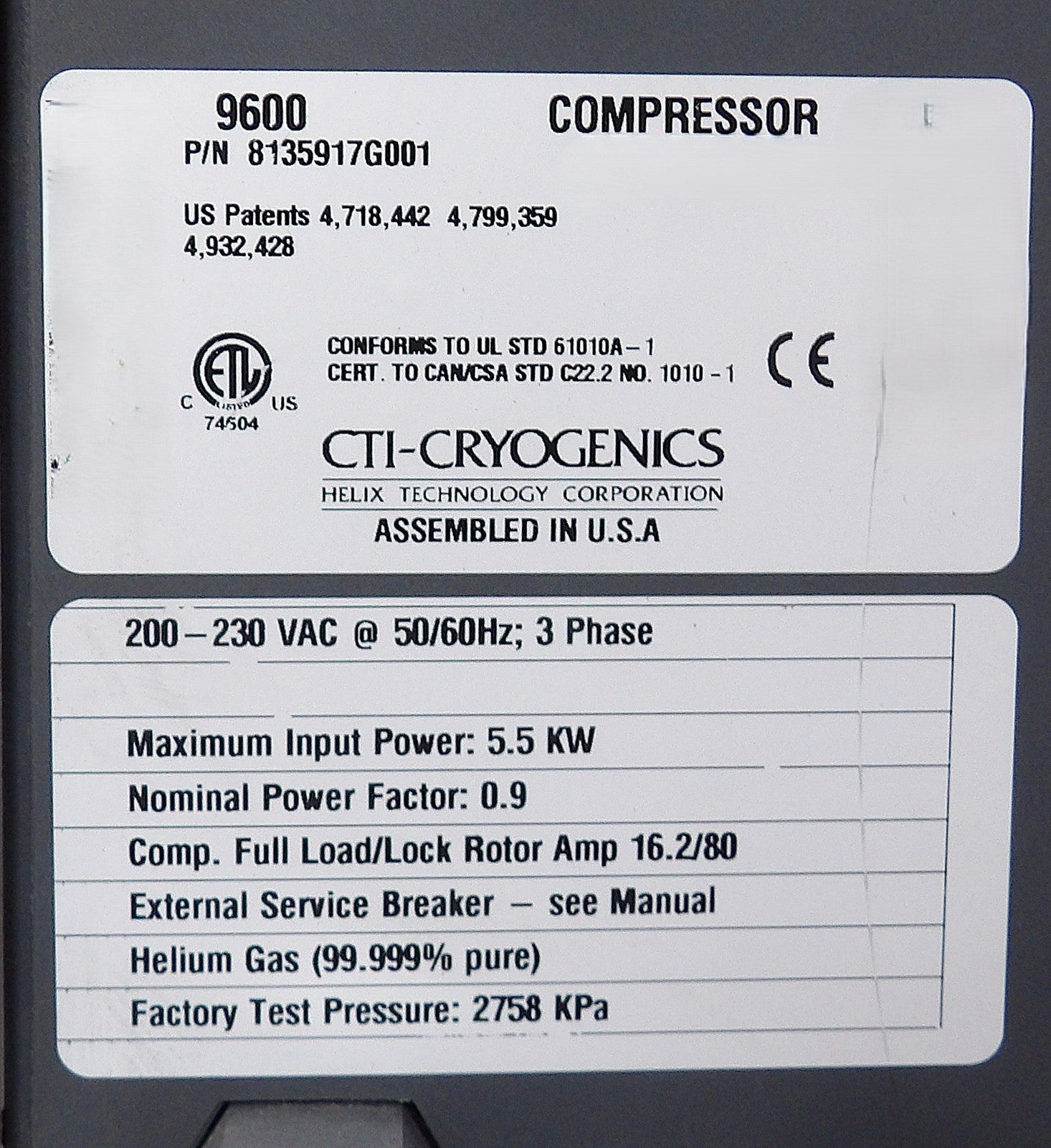CTI-Cryogenics 8135917G001 9600 Compressor Helium Cryopump Tested Working