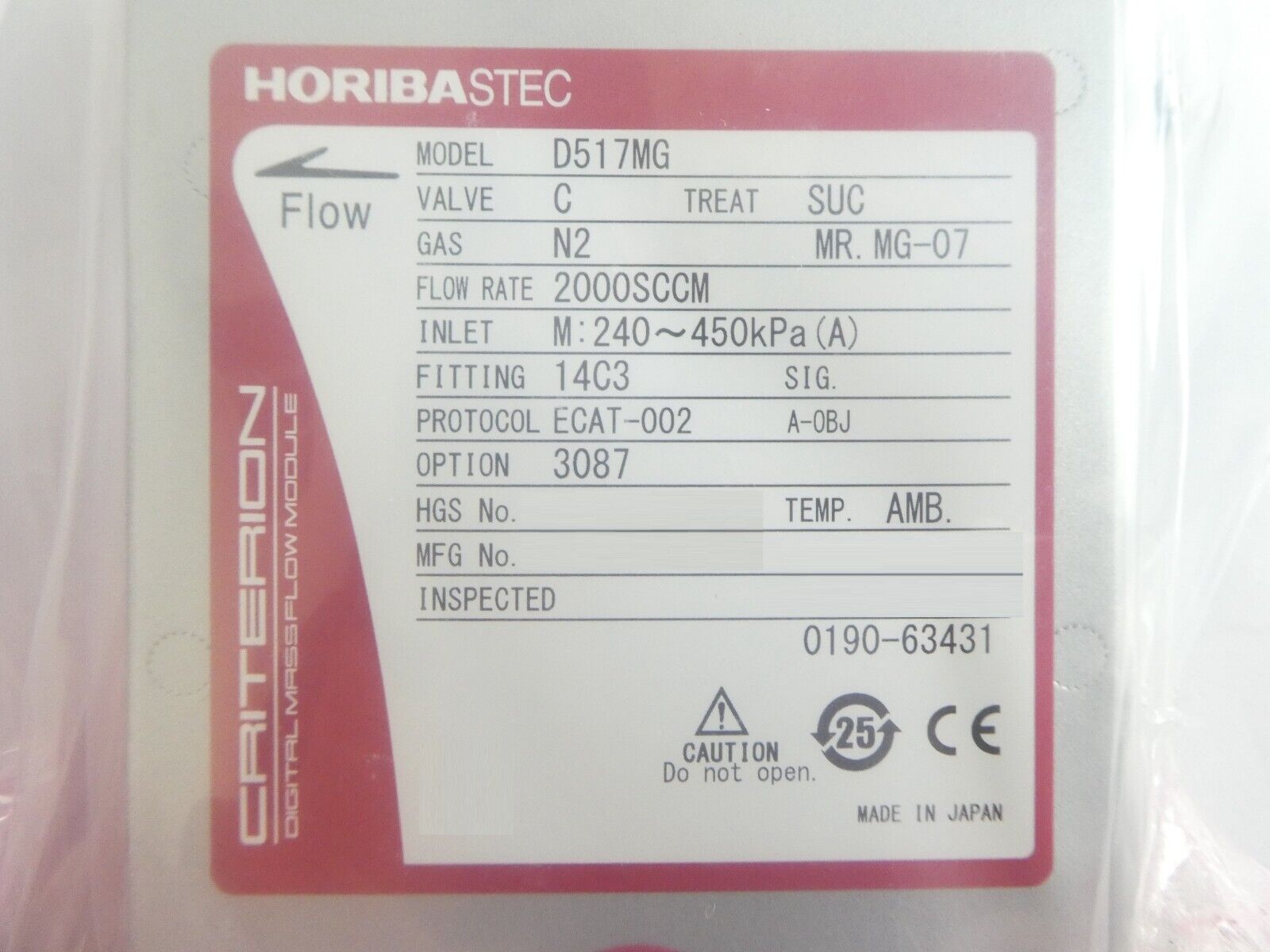 • Part No: D517MG; 1000 SCCM, N2, 0190-63430 (Qty. 2)