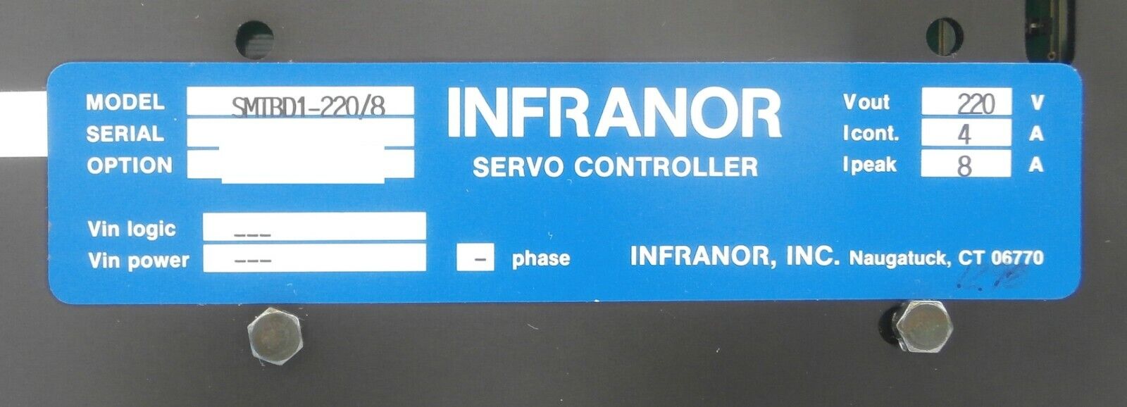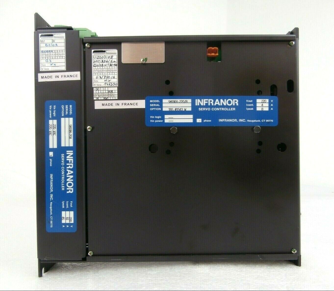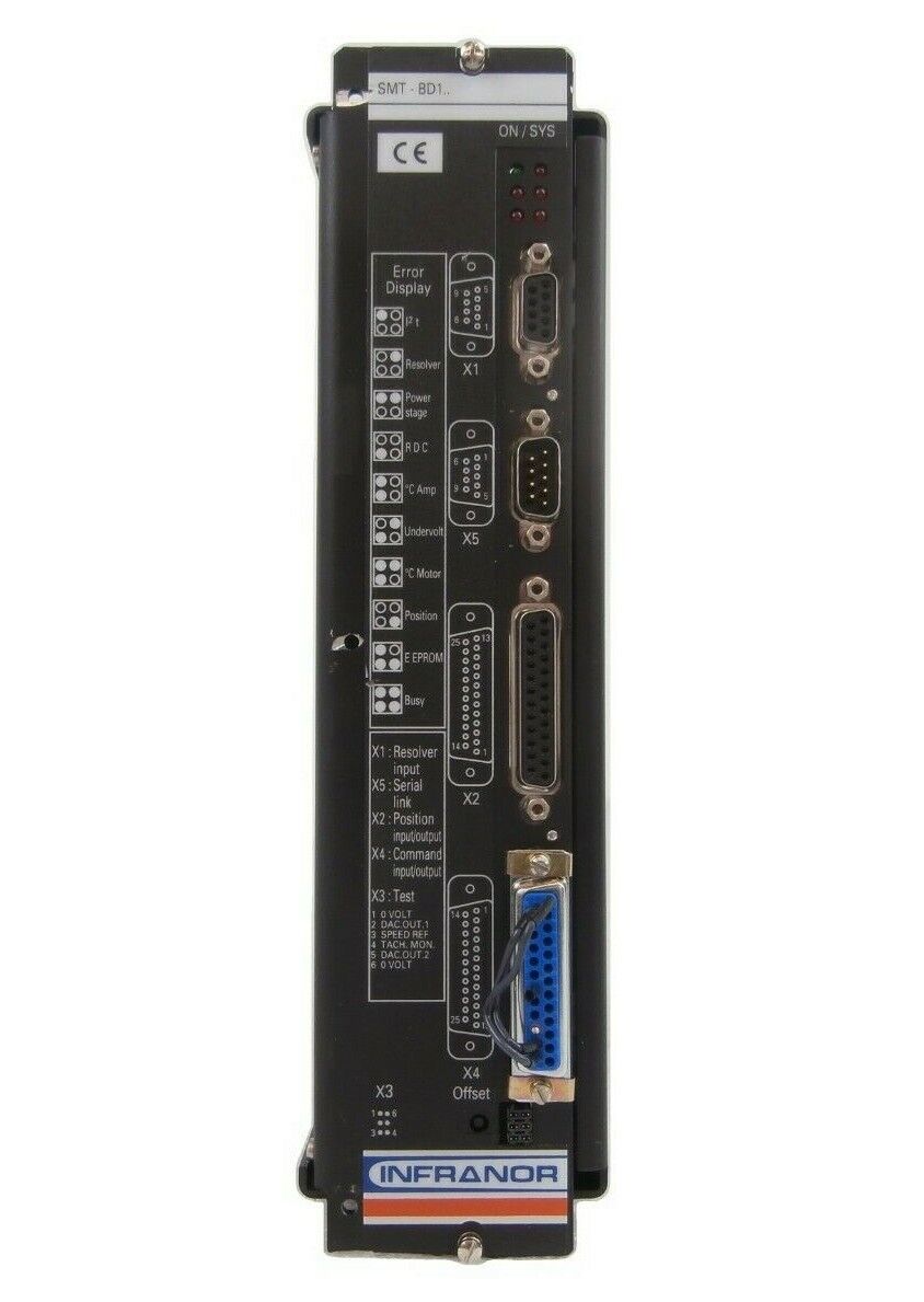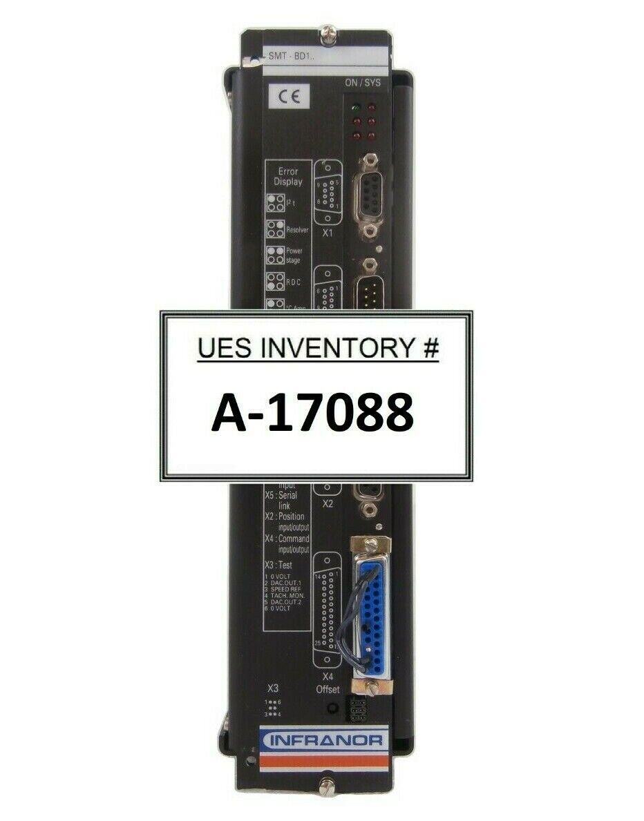 This Infranor SMTBD1-220/8 Digital Brushless Servo Controller SMTBM-20A is used working surplus. The physical condition is good, but there are signs of previous use and handling.
