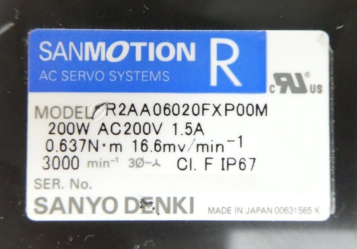 This Sanyo Denki R2AA06020FXP00M AC Servo Motor is used working surplus. The physical condition is good, but there are signs of previous use and handling.