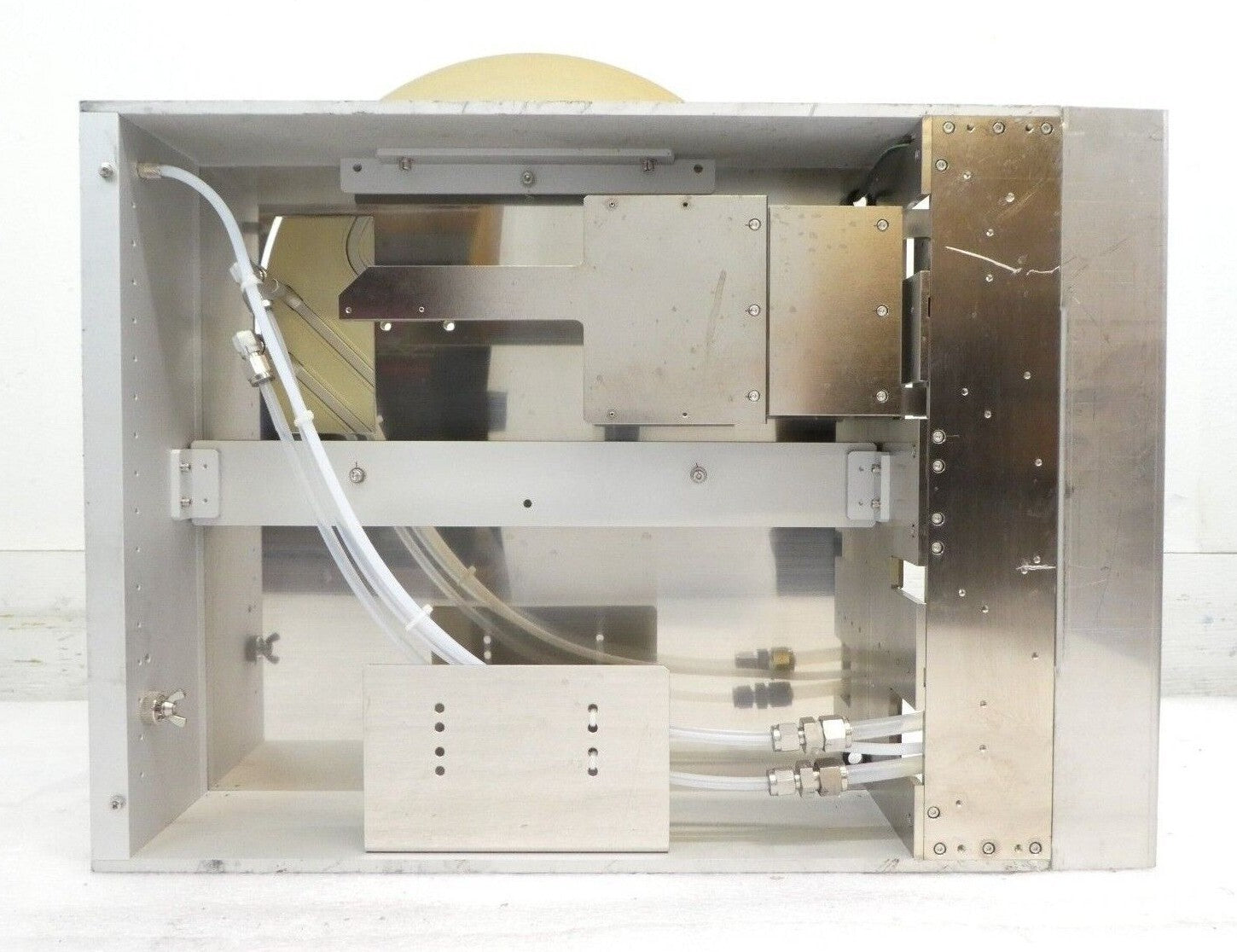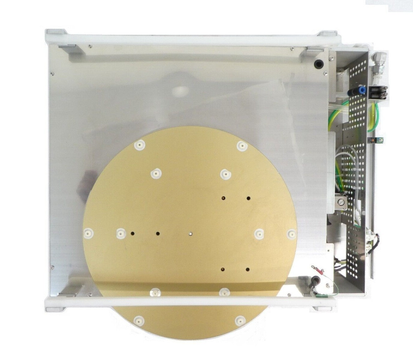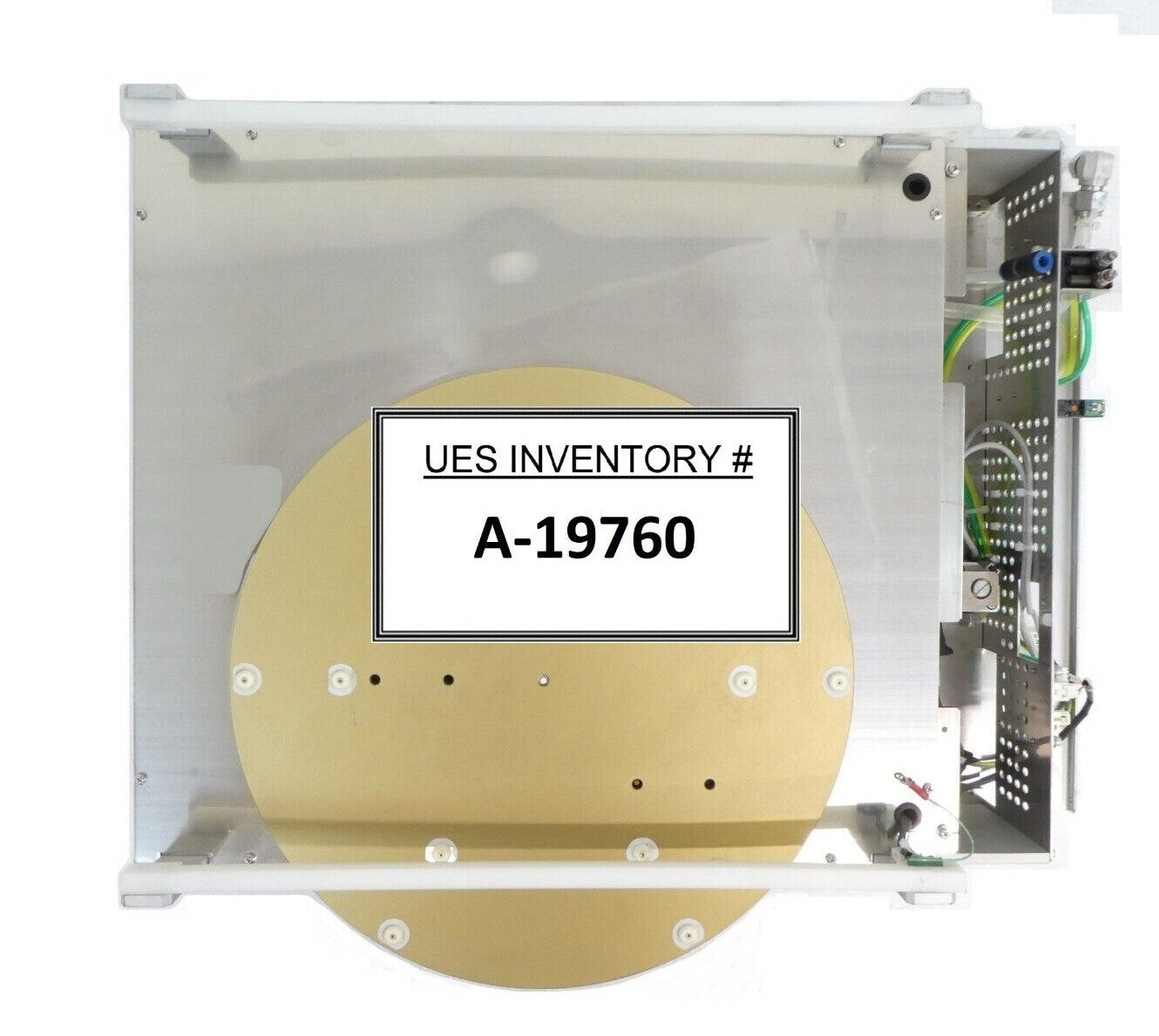 This TEL Tokyo Electron 848 TCP Transition Chill Plate Left is used untested surplus and is being sold as-is. The unit is has several damaged sensors, connectors, and panels are slightly bent (see photos). The physical condition is good and there are visible signs of previous use and handling.
