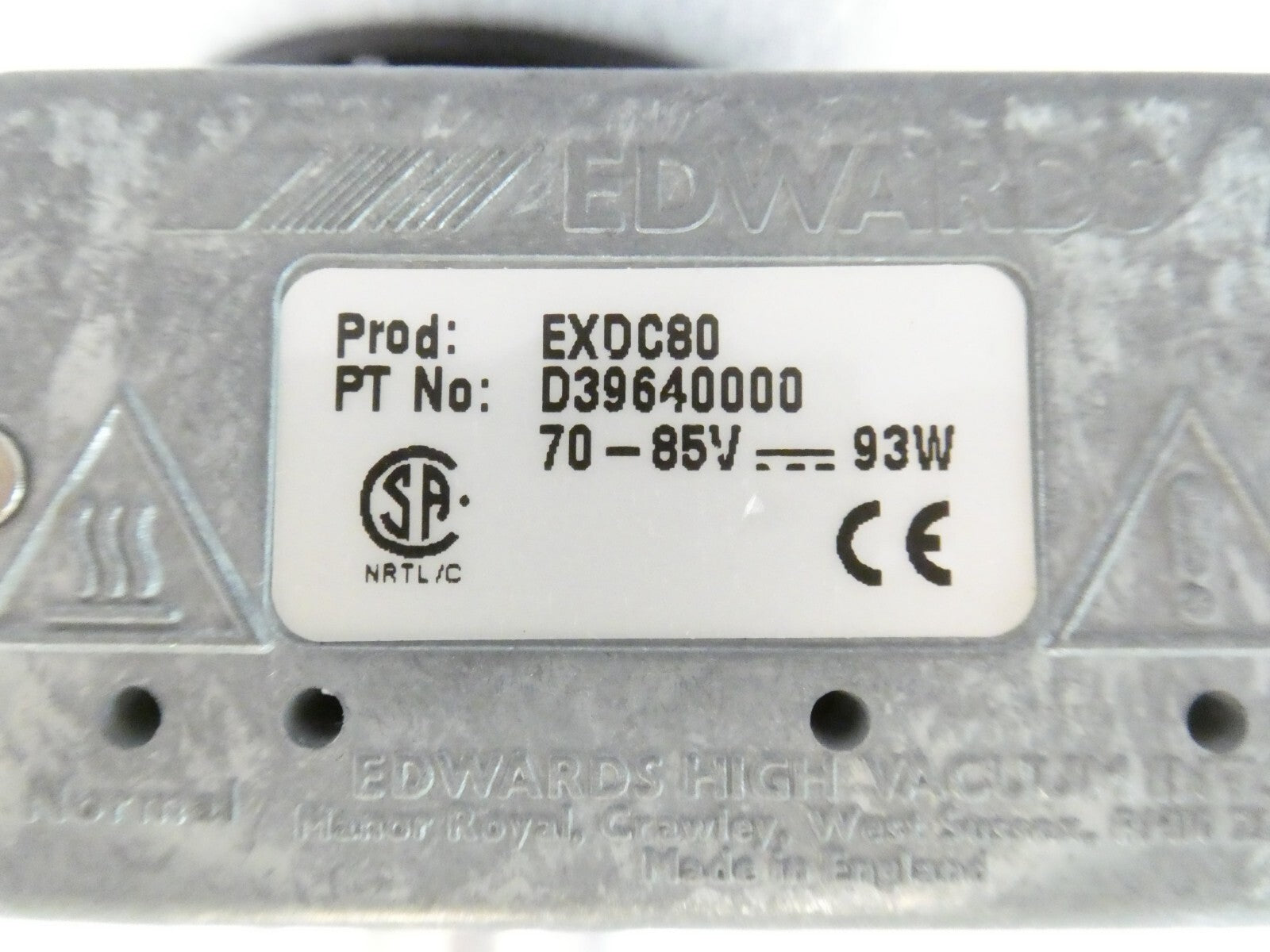 This EXT 255H Edwards B753-01-000 Turbomolecular Pump is used working surplus. It was tested in our facility and is fully functional. The unit ramped up to full speed and pumped down to 5 mTorr. The physical condition is good, but there are signs of previous use and handling.