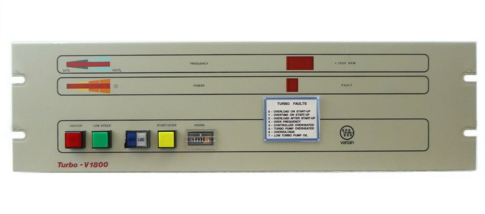 This TV-1800 Varian 9699461S002 Turbo Pump Controller is manufacturer refurbished surplus. The physical condition is good, but there may be signs of previous use and handling.