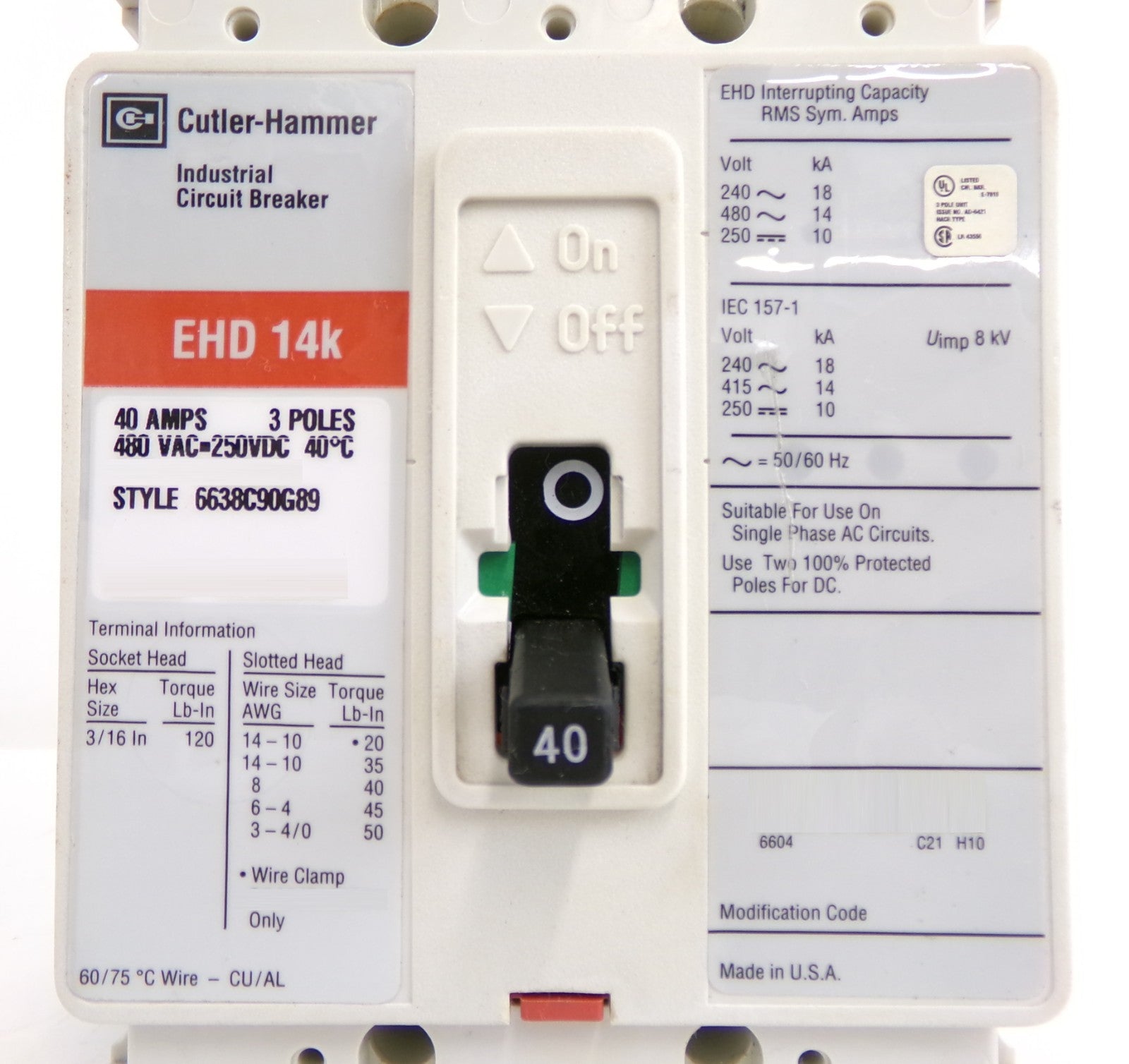 Cutler-Hammer 6638C90G89 3-Pole Industrial Circuit Breaker EHD 14k Working