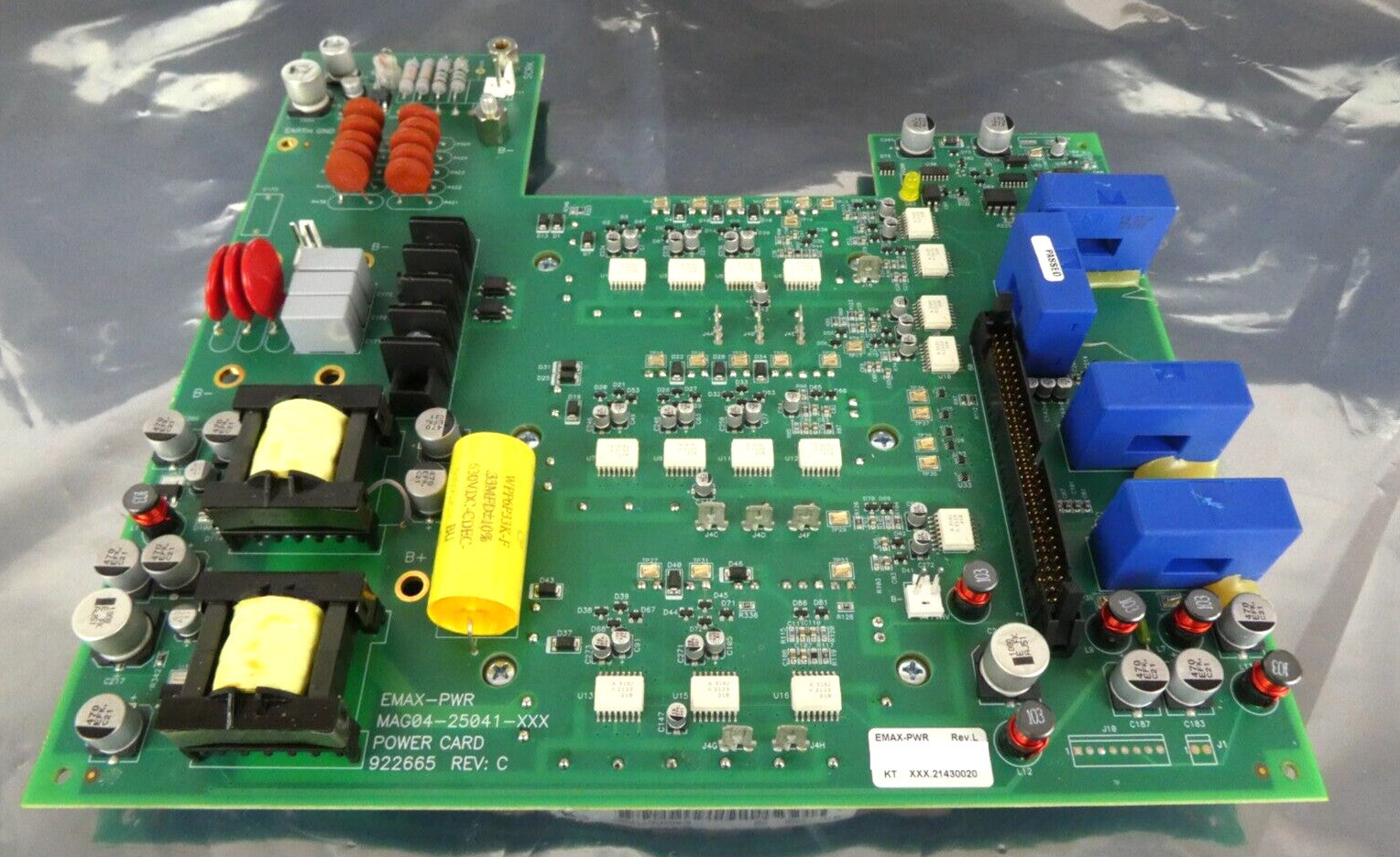 This Kollmorgen MAG04-25041-XXX EMAX Power PCB Card is used working surplus. The physical condition is good, but there are signs of previous use and handling.