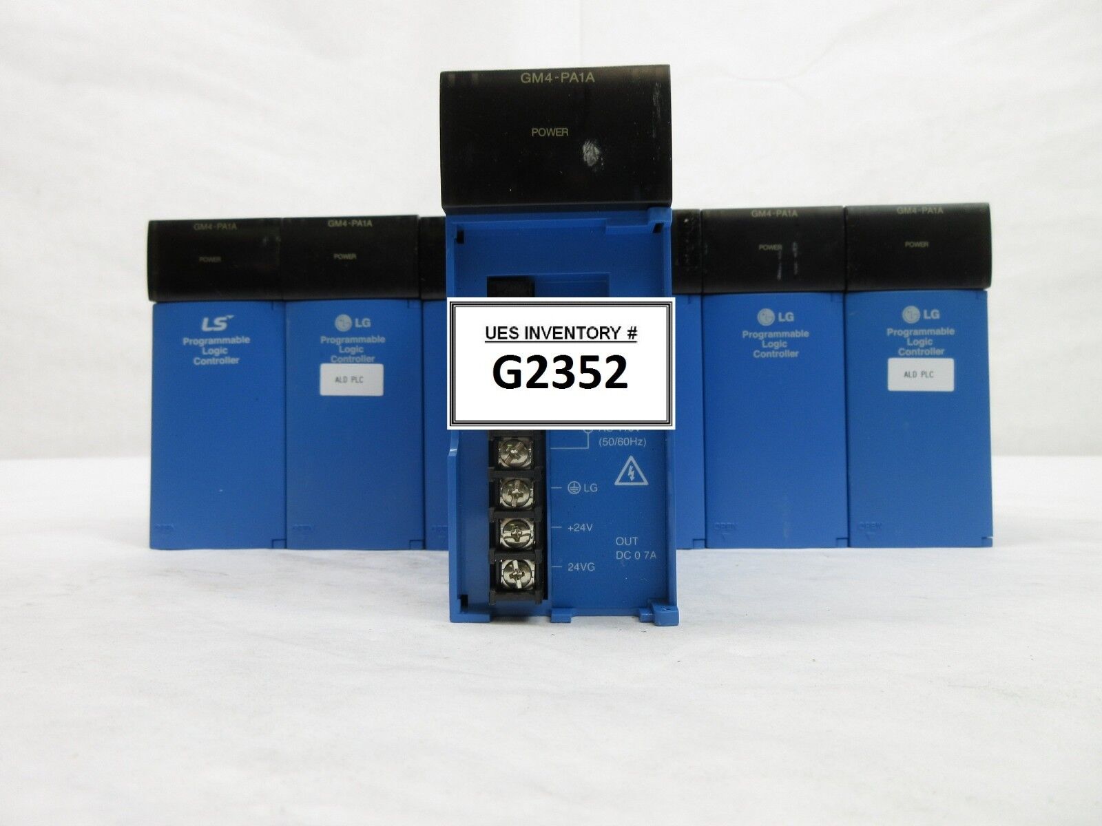 This LG GM4-PA1A LS Power Supply PLC Reseller Lot of 7 is used working surplus. The physical condition is good, but there are signs of previous use and handling. One unit is missing the door (see photos).