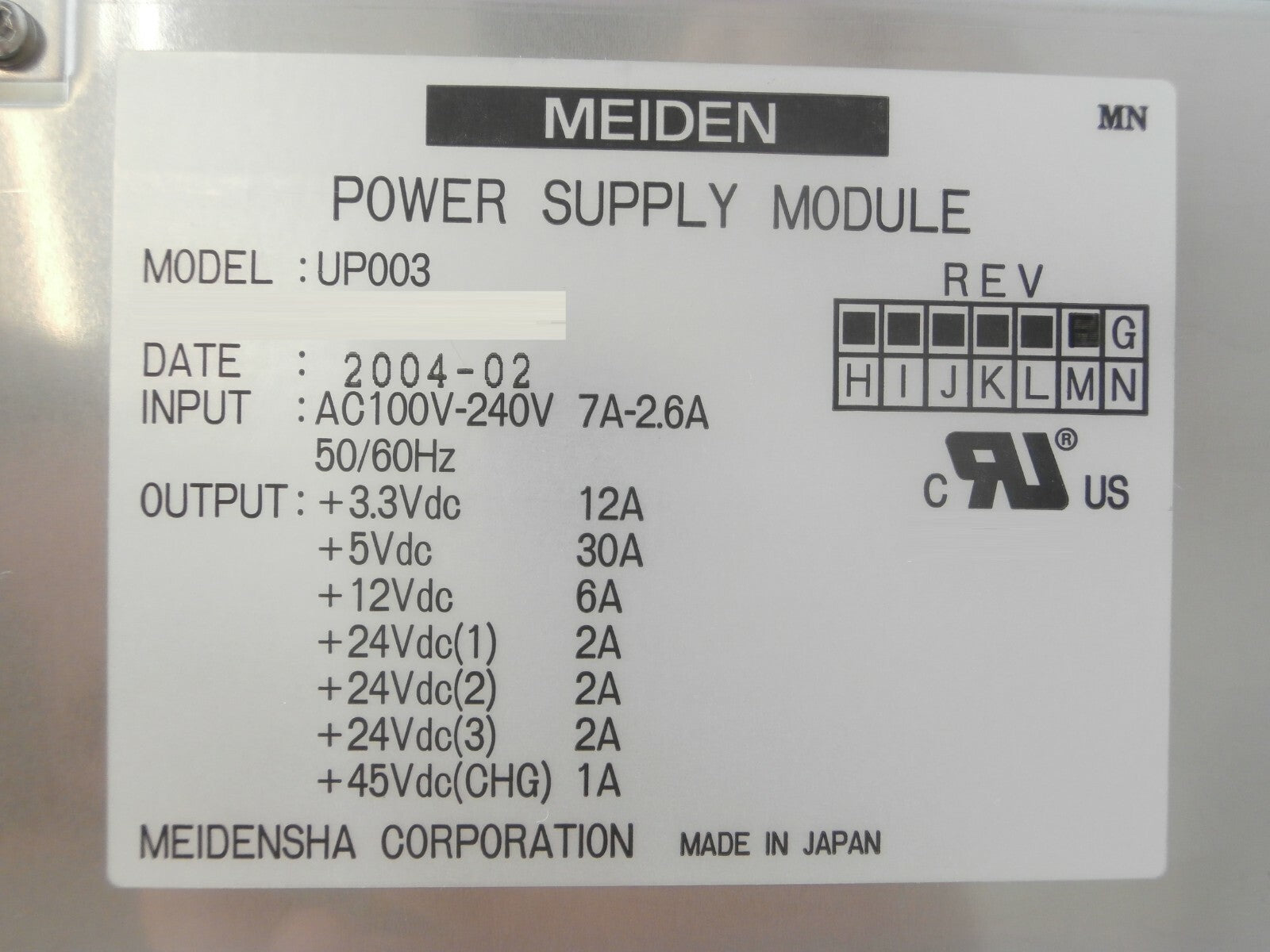 This Meiden UP003 Power Supply Module PCB Card TEL Tokyo Electron Lithius is used working surplus. The physical condition is good, but there are signs of previous use and handling.