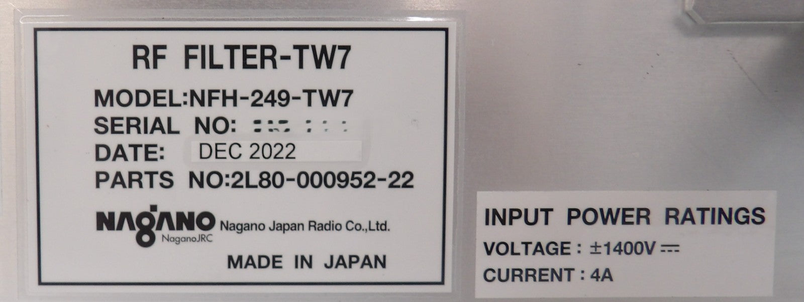 Nagano NFH-249-TW7 RF Filter TEL Tokyo Electron 2L80-000952-22 Working Surplus