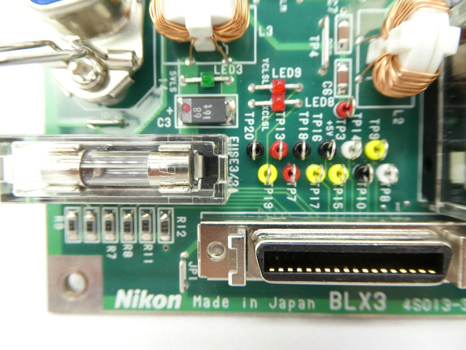 This Nikon 4S013-310 BLX3 Board PCB is used working surplus. The physical condition is good, but there are signs of previous use and handling.