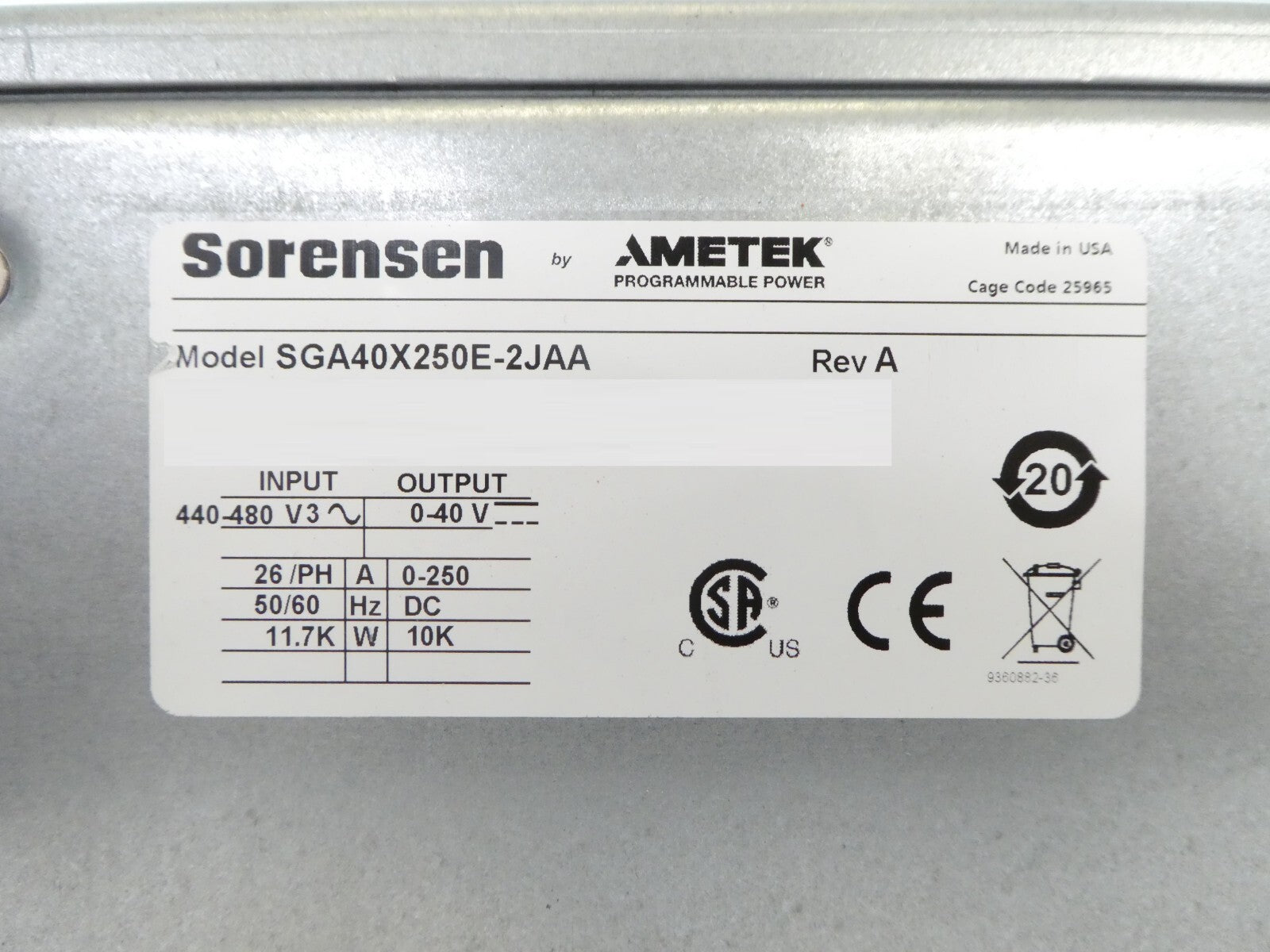 Sorensen SGA40X250E-2JAA 10kW DC Power Supply SGA 40/250 Ametek Spare Surplus