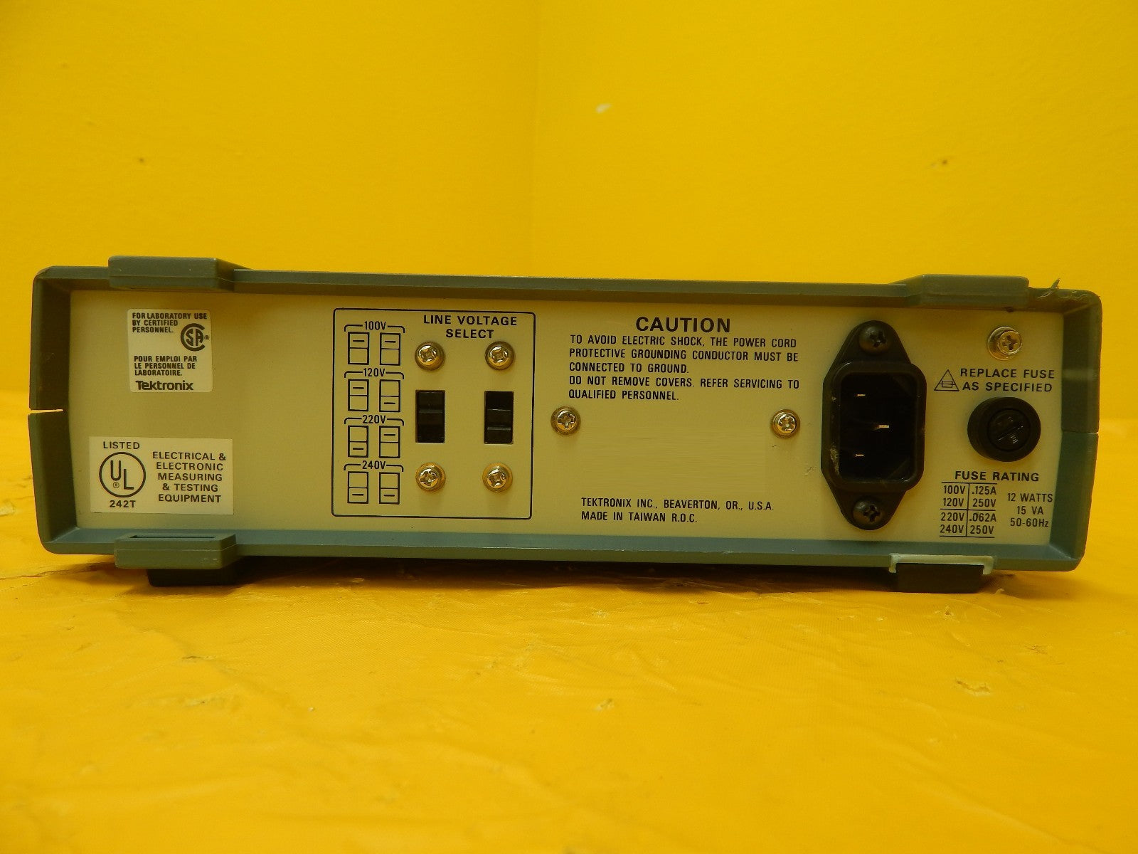 This Tektronix CFC250 is used working surplus. The physical condition is good, but there are signs of previous use and handling. One rear clip is broken but this does not interfere with normal operation (see photos).