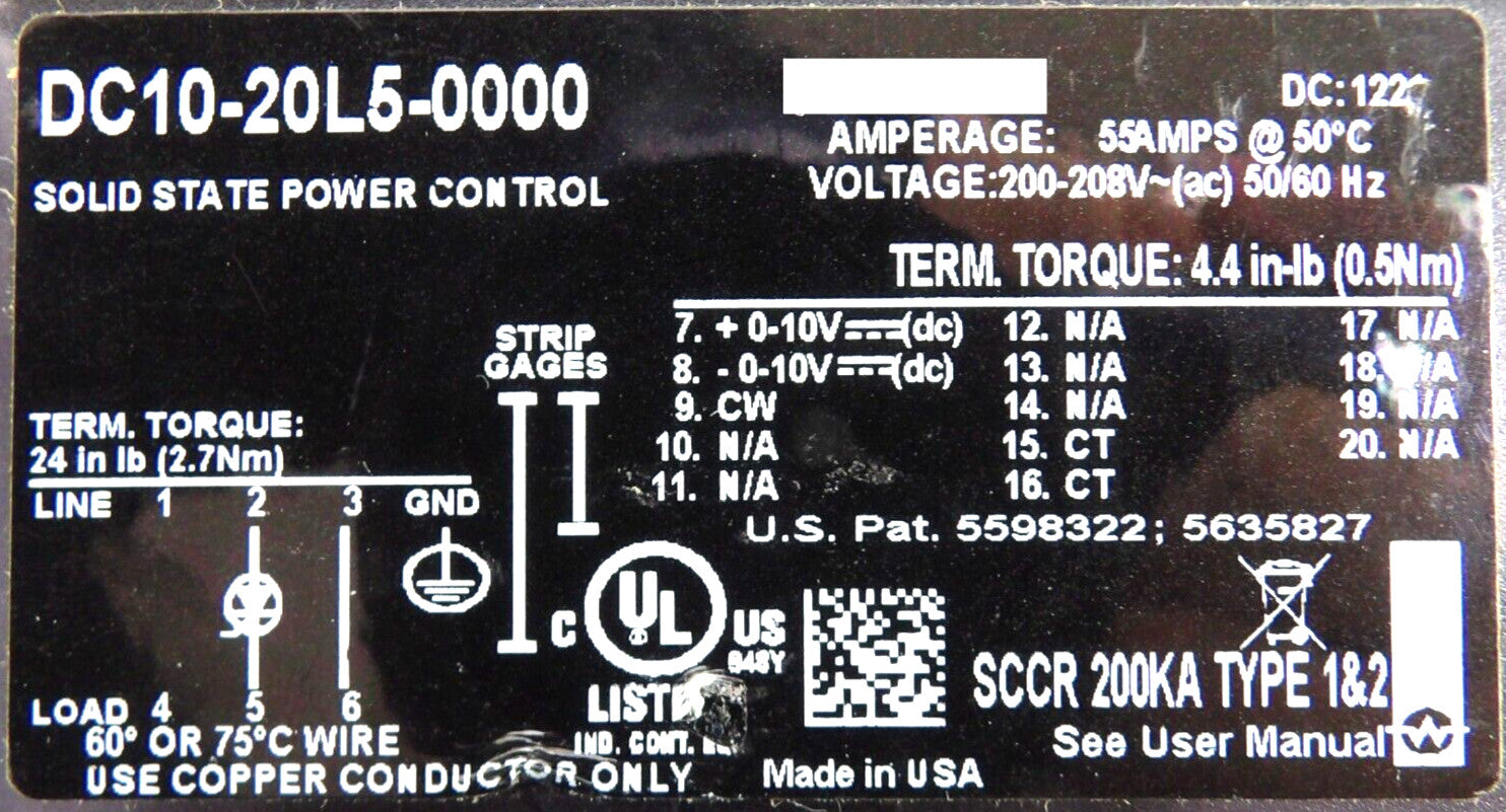 This Watlow DC10-20L5-0000 Solid State Power Control is used working surplus. The physical condition is good, but there are signs of previous use and handling.